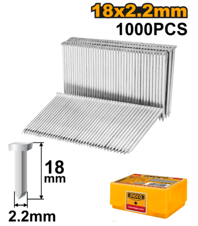 ₵50.00| Length:18mm 1000pcs/plastic box Suitable for ACN18641, CSTLI3805, CSTLI3808 Nail head:6.4mmX2.2mm Shank diameter:2.2mm Packed by plastic box |