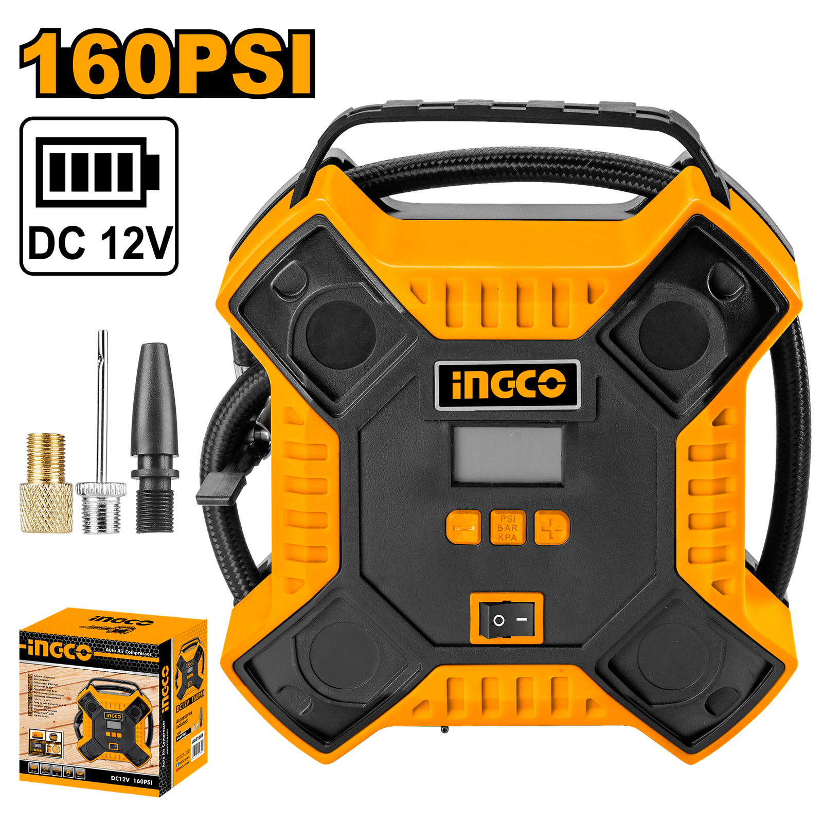 | Voltage:12V Max pressure:160PSI/11Bar Max air flow:35L/min Integrated work light With 1pcs 3m cord with cigarette lighter With 3pcs adaptors Packed by color box |