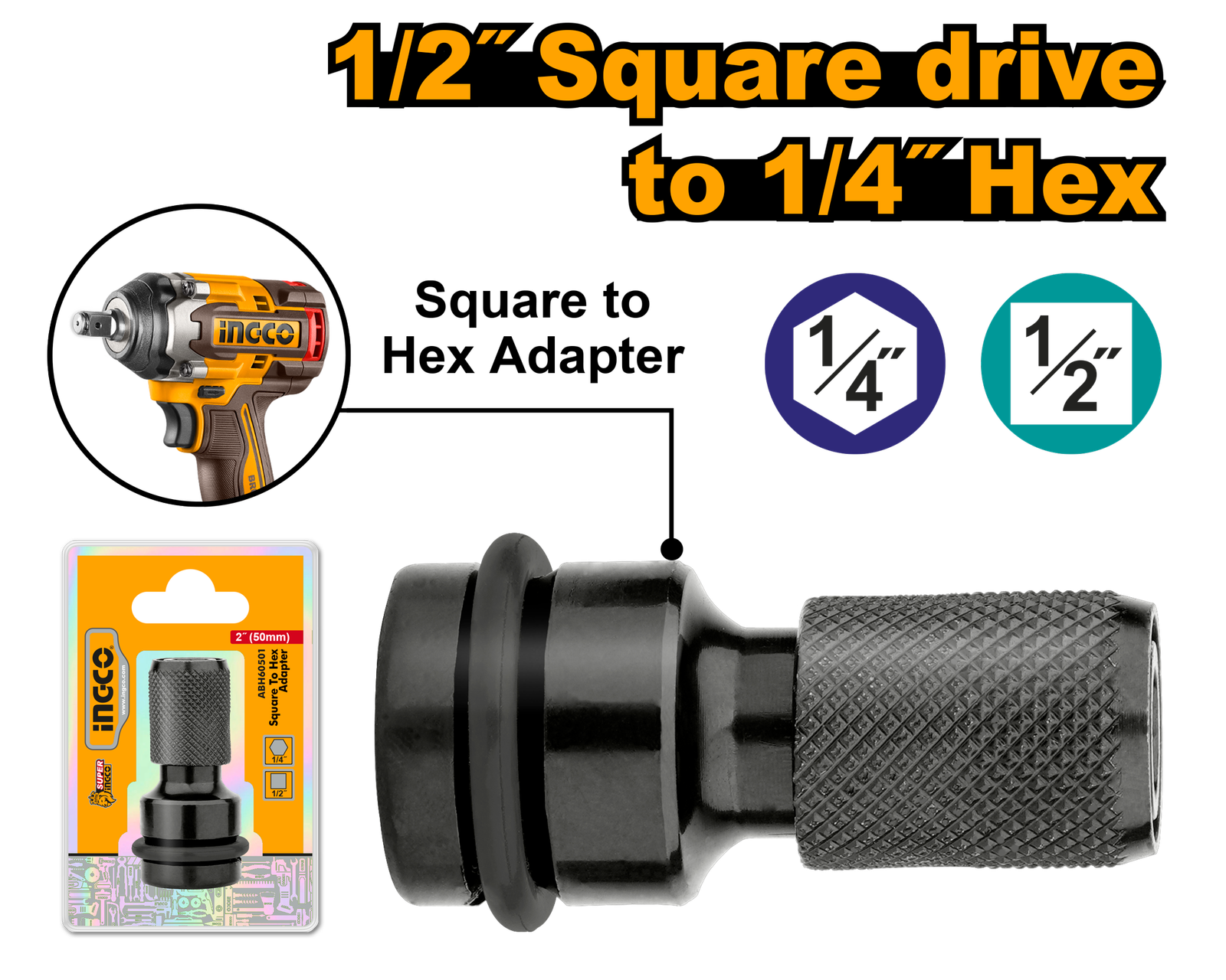| Shank size: 1/2″ square Drive size: 1/4″ Hex Overall length: 2″(50mm) Socket adapter transform impact wrench into impact drivers with square hex bits Packed by double blister |