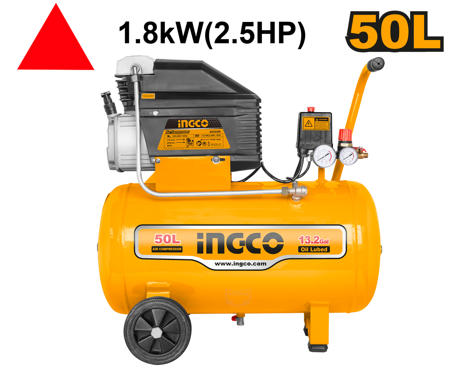 | Voltage:220-240V~50Hz Input power: 1.8kW(2.5HP) Tank:50L(13.2Gal) Noise:96db 1000HR lifetime promise Aluminium wire motor Pump lubricated with oil No-load speed:2850rpm Operation pressure:max.8bar Packed by carton box |