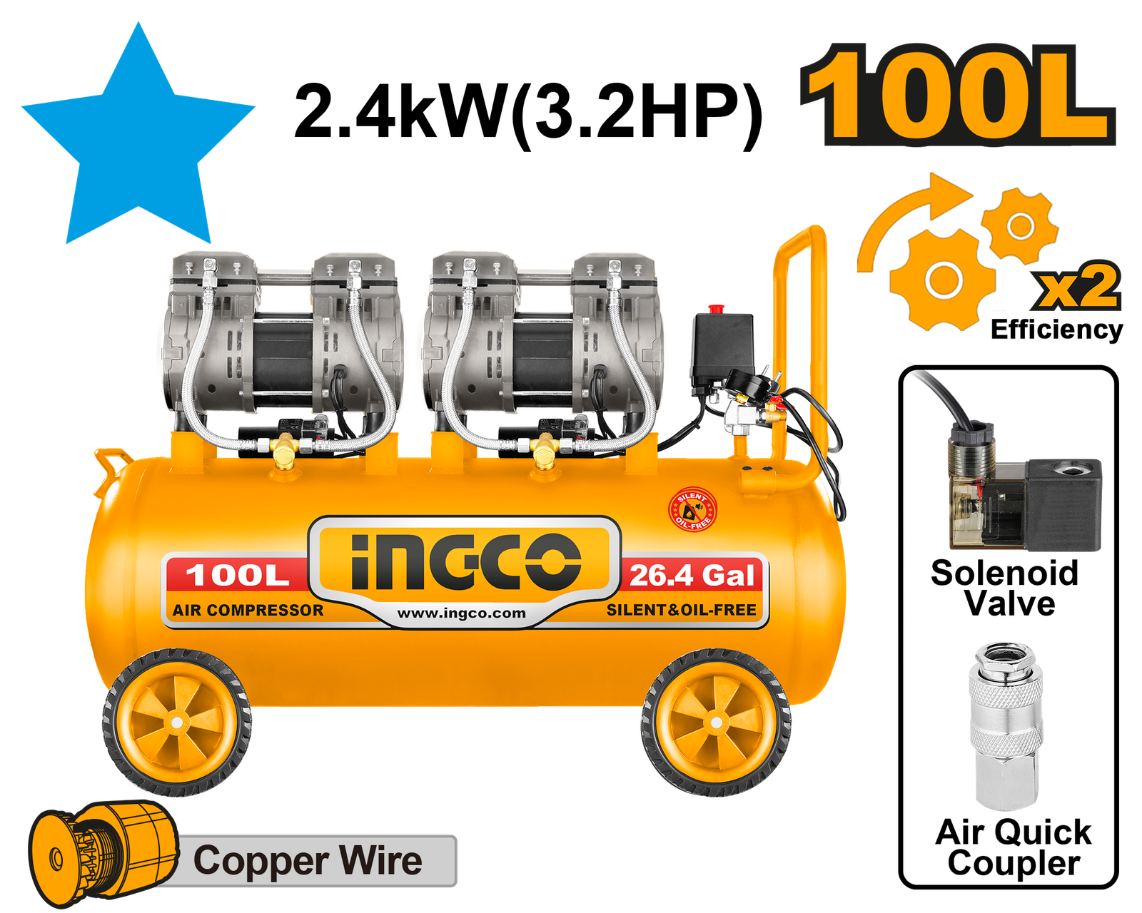 | Voltage:220-240V~50Hz Input power: 2×1200W (3.2HP) Tank:100L(26.4Gal) Oil free system Noise: 75db Copper wire motor No-load speed:2850rpm Operation pressure:max.8bar Packed by plywood case |