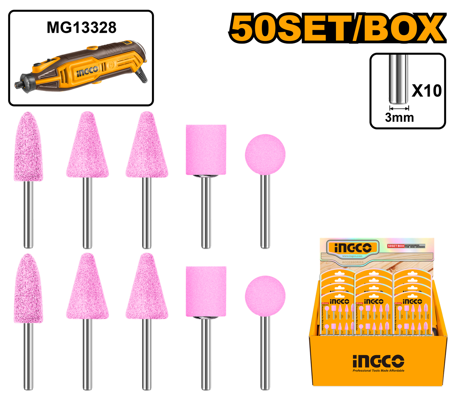 | Accessories for mini grinder, 3mm shank,suitable for MG13328 MG2008 CMGLI2001 2 Pcs bullet type 10*18mm 4 Pcs cone 13*21mm 2 Pcs T-type 12*13mm 2 Pcs round 12*12mm Packed by double blister and color box |