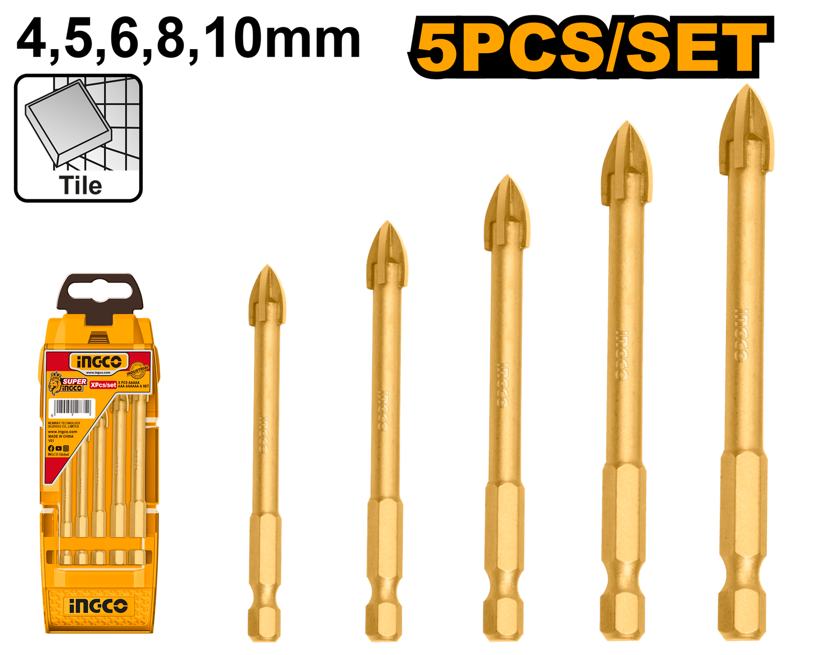 | 5 Pcs glass drill bits Cross head carbide tip High quality carbide tip Size:4mm,5mm,6mm,8mm,10mm Shank:1/4″ hex shank,Titanium finishing Packed by plastic box |