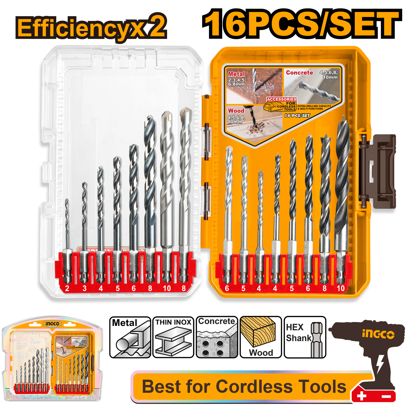 | 16 Pcs metal,masonry,and wood drill bits set Hex shank 6Pcs metal drill bits set Size:2,3,4,5,6,8mm 5Pcs masonry drill bits Size:4,5,6,8,10mm 5pcs wood drill bits Size:4,5,6,8,10mm Packed by double blister |