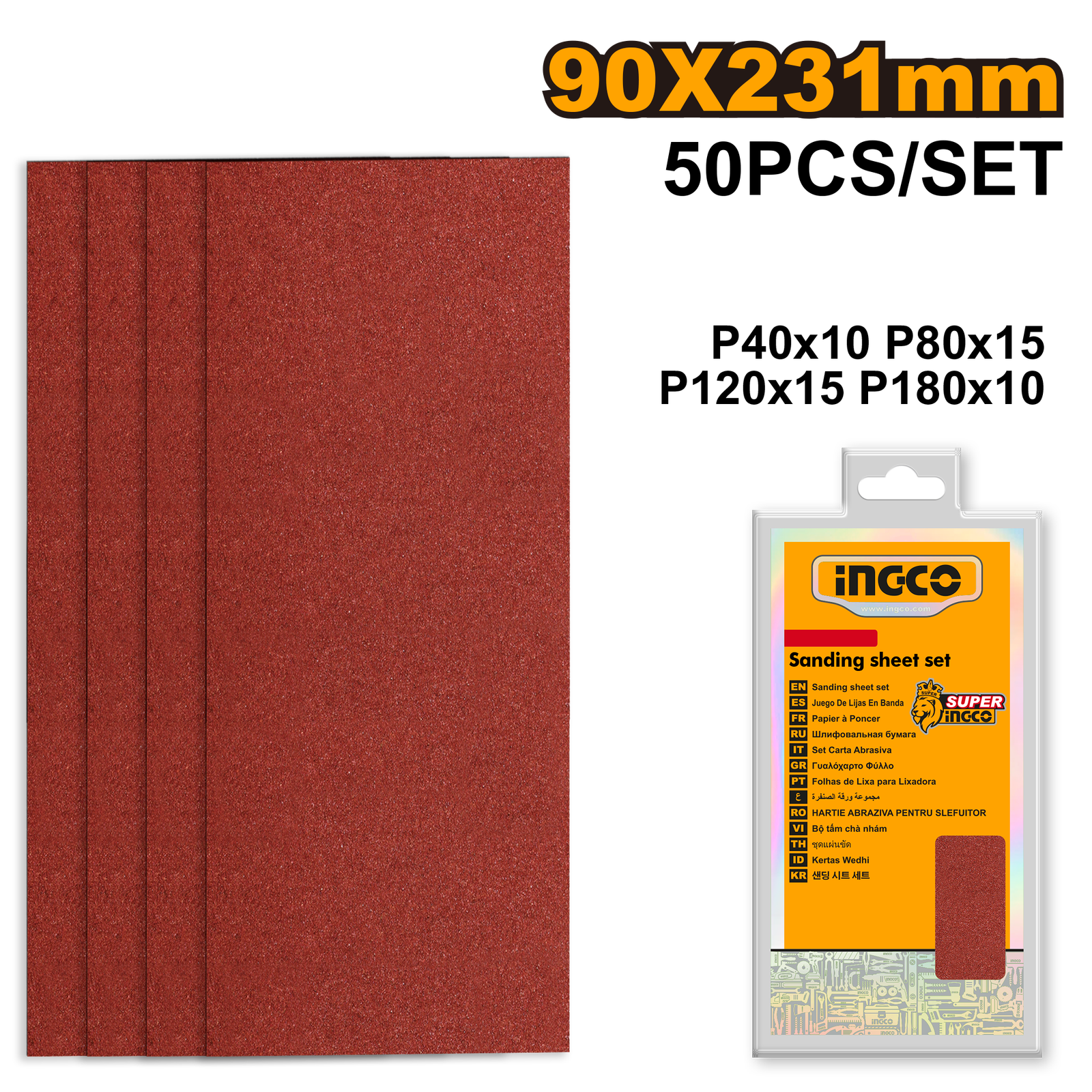 | Size:90X231mm 50Pcs/set P40x10pcs P80x15pcs P120x15pcs P180x10pcs Suitable for grinding wood, wall, paint, plastic, stone, metal, glass Packed by double blister |