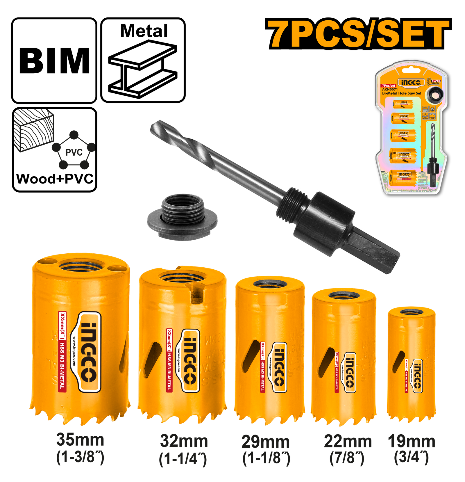 | 7Pcs Bi-metal hole saw set Size: 19mm(3/4″),22mm(7/8″),29mm(1-1/8″),32mm(1-1/4″),35mm(1-3/8″) 1 Pcs adapter: 1/2″-20″ threads to fit hole saws 5/8″~18″thread 1 pcs arbor: 3/8″ Hex Shank, Fit Size:9/16″~1-3/16″ Packed by doulble blister |