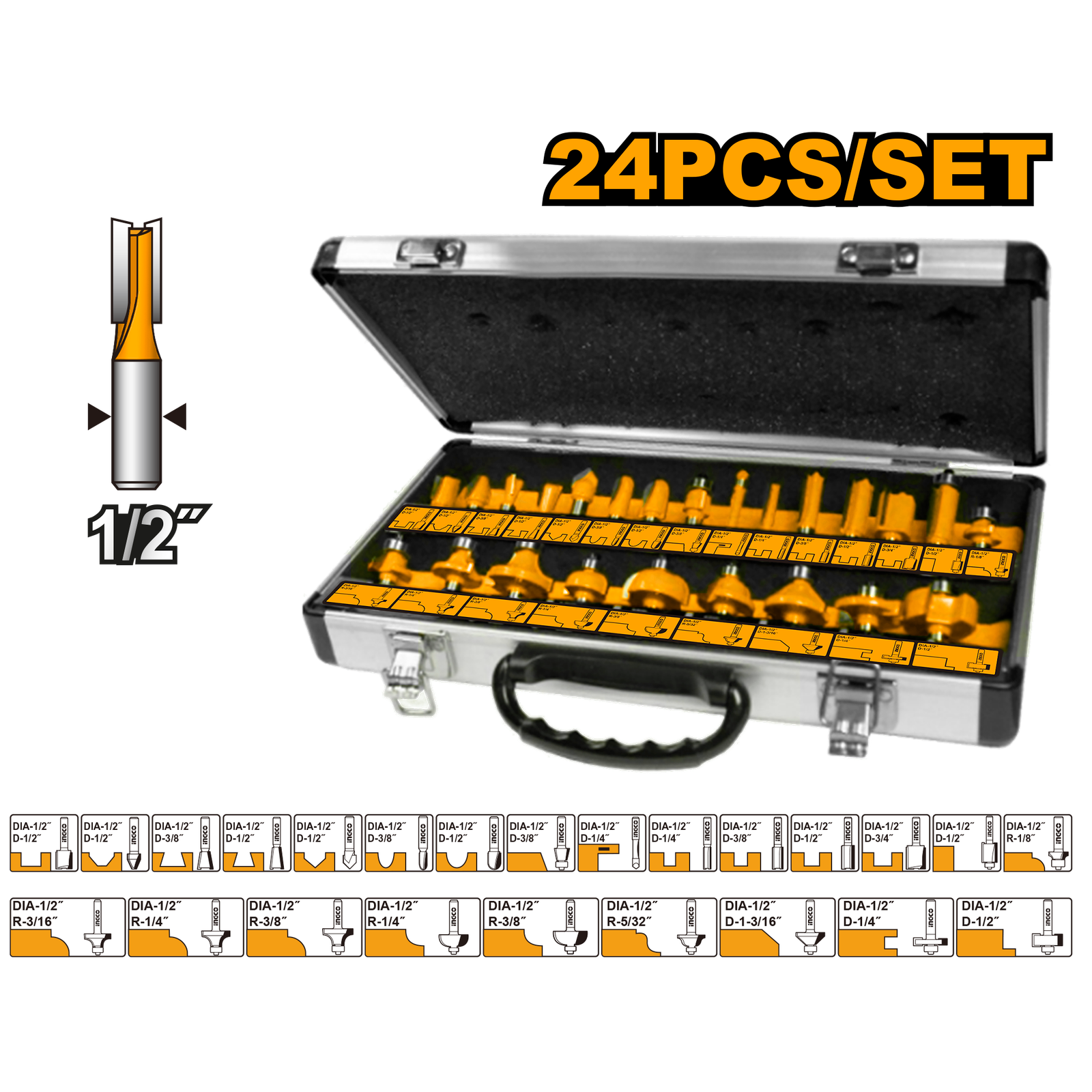 | 24 Pcs router bits set Shank diameter:8mm 1 Pcs 12.7mm mortising bit 1 Pcs 12.7mm combination bit 1 Pcs 9.5mm Dovetall bit 1 Pcs 12.7mm Dovetall bit 1 Pcs 12.7mm 90°Grooving bit 1 Pcs 9.5mm Round nose bit 1 Pcs 12.7mm Round nose bit 1 Pcs 9.5mm Trjmming bit 1 Pcs 6.35mm Panel pilot bit 1 Pcs 6.35mm Straight bit 1 Pcs 9.5mm Straight bit 1 Pcs 12.7mm Straight bit 1 Pcs 19.0mm Stright bit 1 Pcs 12.7mm Flush trm bit 1 Pcs 3.2mm Rolind over bit 1 Pcs 4.76mm Round over bit 1 Pcs 6.35mm Round over bit 1 Pcs 9.5mm Round over bit 1 Pcs 6.35mm Cove bit 1 Pcs 9.5mm Cove bit 1 Pcs 4.0mm Roman ogee bit 1 Pcs 30.0mm 45°chamfer bit 1 Pcs 6.35mm Rabbeting bit 1 Pcs 12.7mm Rabbeting bit Packed by Aluminum case |