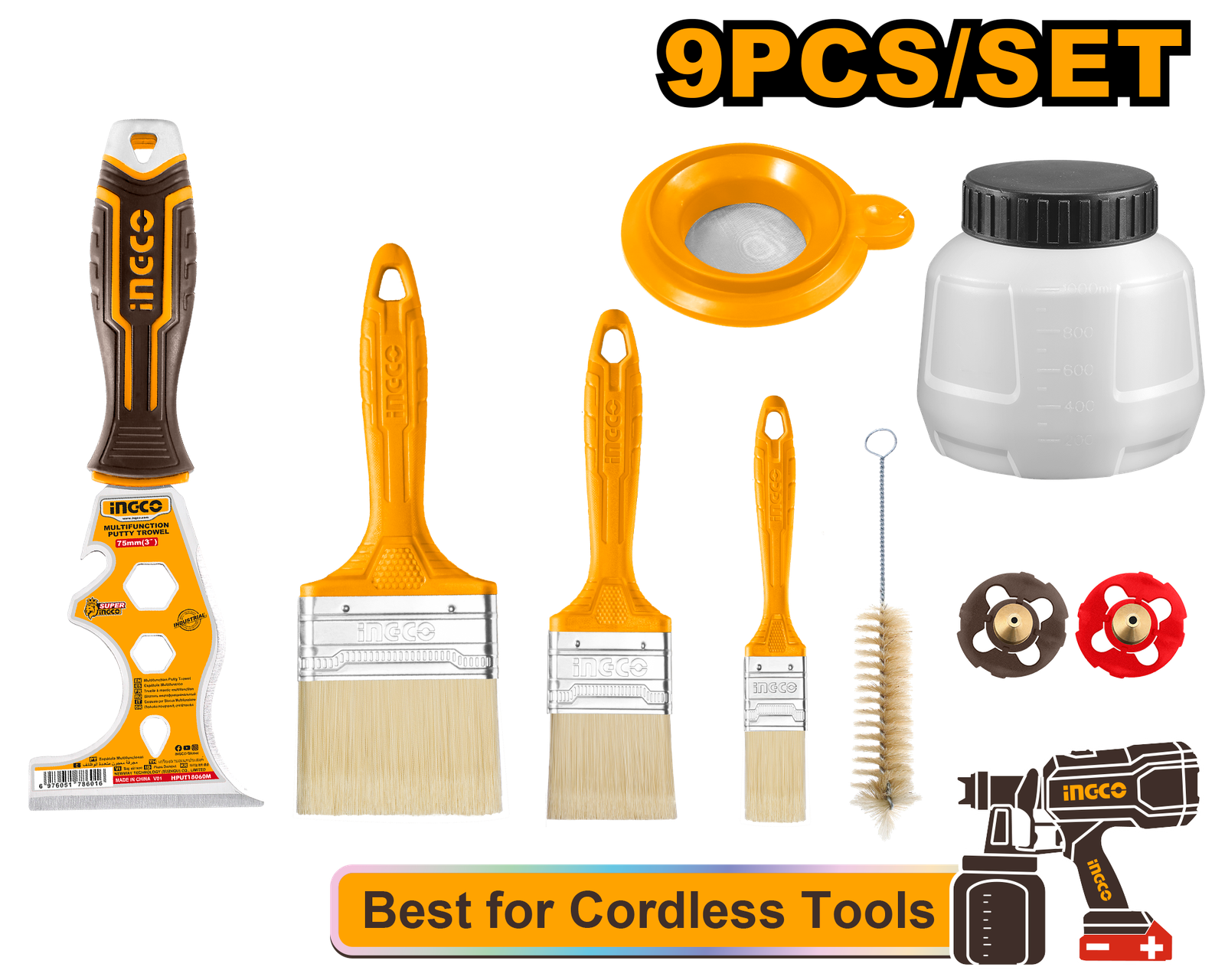 | 9 Pcs Paint tool set Only suitable for CSGLI2003 CSGLI20406 and UCSGLI20406 Include: 2 Pcs copper nozzle(1.0mm 1.8mm) 1 Pcs paint can 1 Pcs sieve 1 Pcs wire brush 1 Pcs multifunction putty trowel 1 Set paint brush Packed by color box |