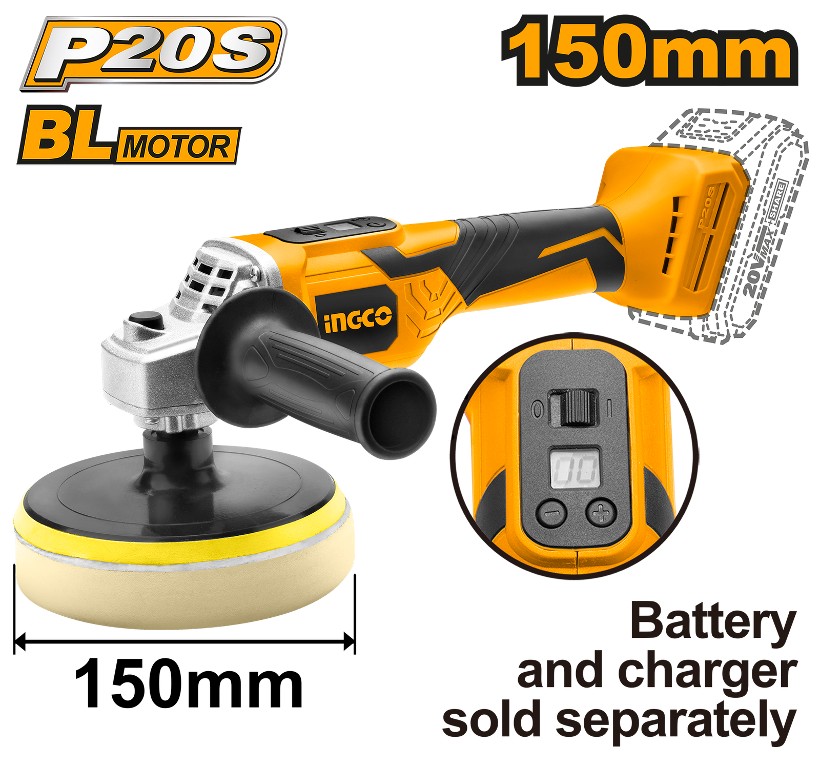 | Brushless motor Voltage:20V No-load speed:500-2800rpm Polishing pad diameter:150mm Spindle thread:M14 Variable speed control Digital display Battery and charger sold separately Packed by color box |