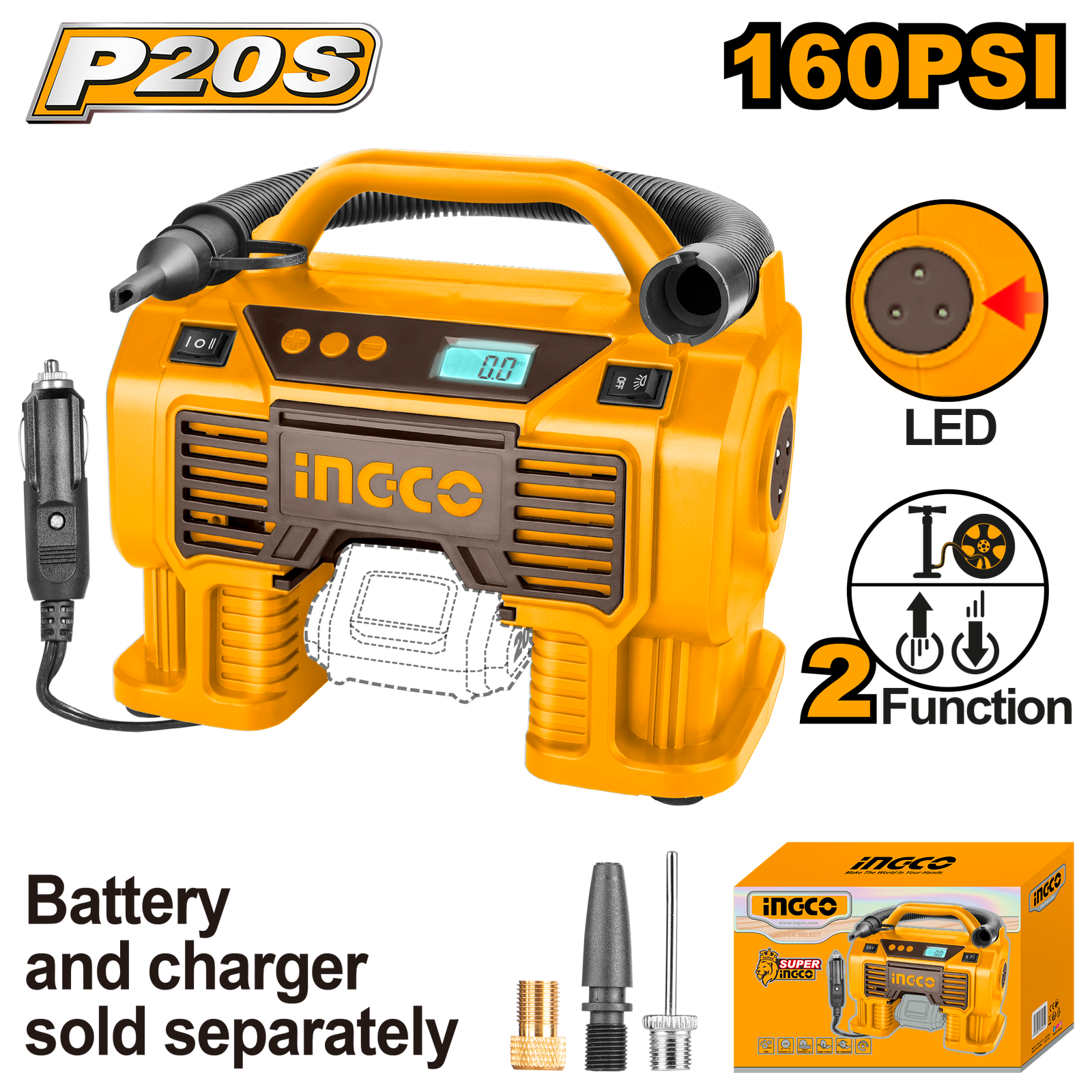| Voltage:20V Max pressure:160PSI/11BAR Integrated work light With 3pcs adaptors With 1pcs air tube With 1pcs 3m cord with cigarette lighter Battery and charger sold separately Packed by color box |