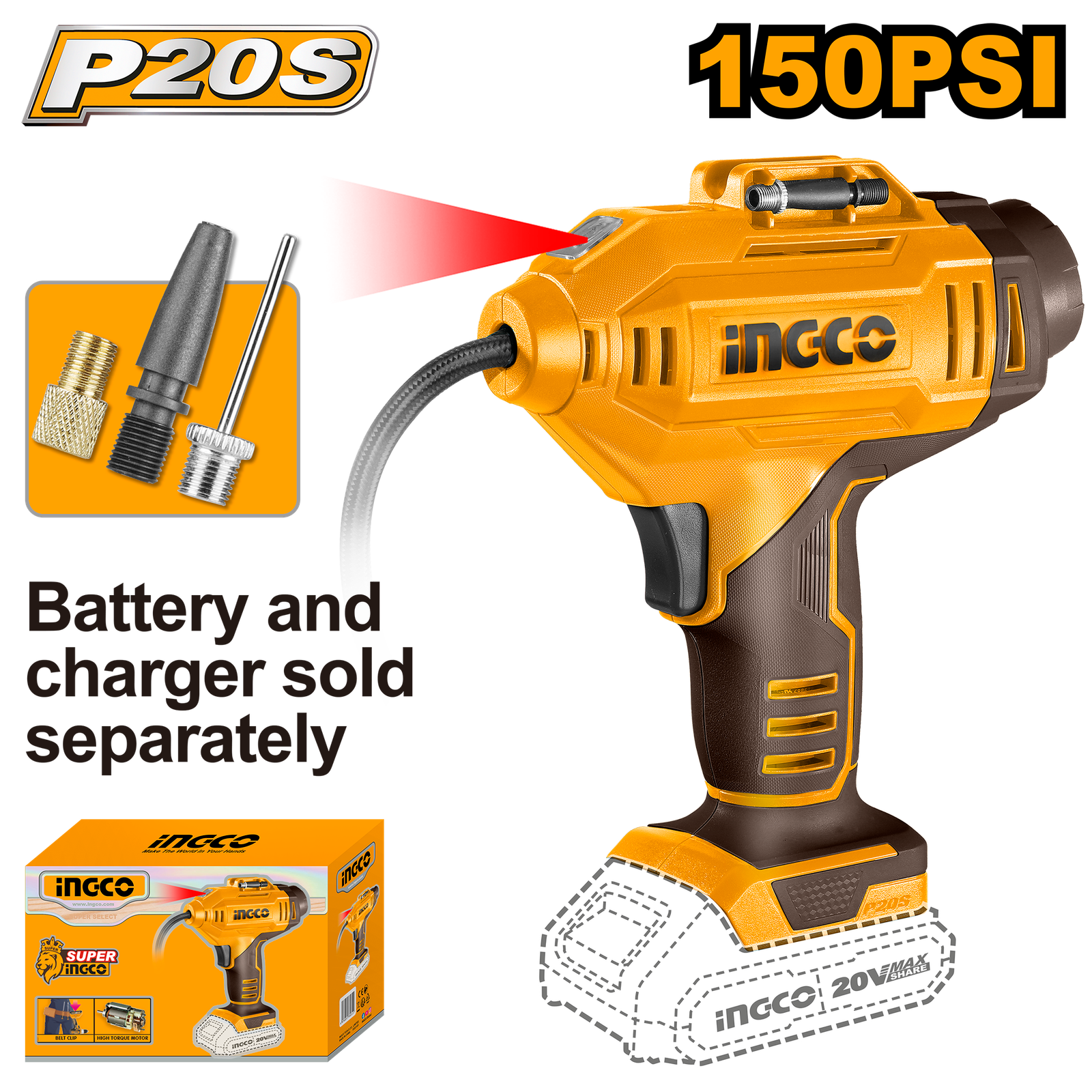| Voltage: 20V Max pressure: 150PSI/10.34BAR/1034KPA Cordless portable design LED light With 3pcs adaptors Battery and charger sold separately Packed by color box |