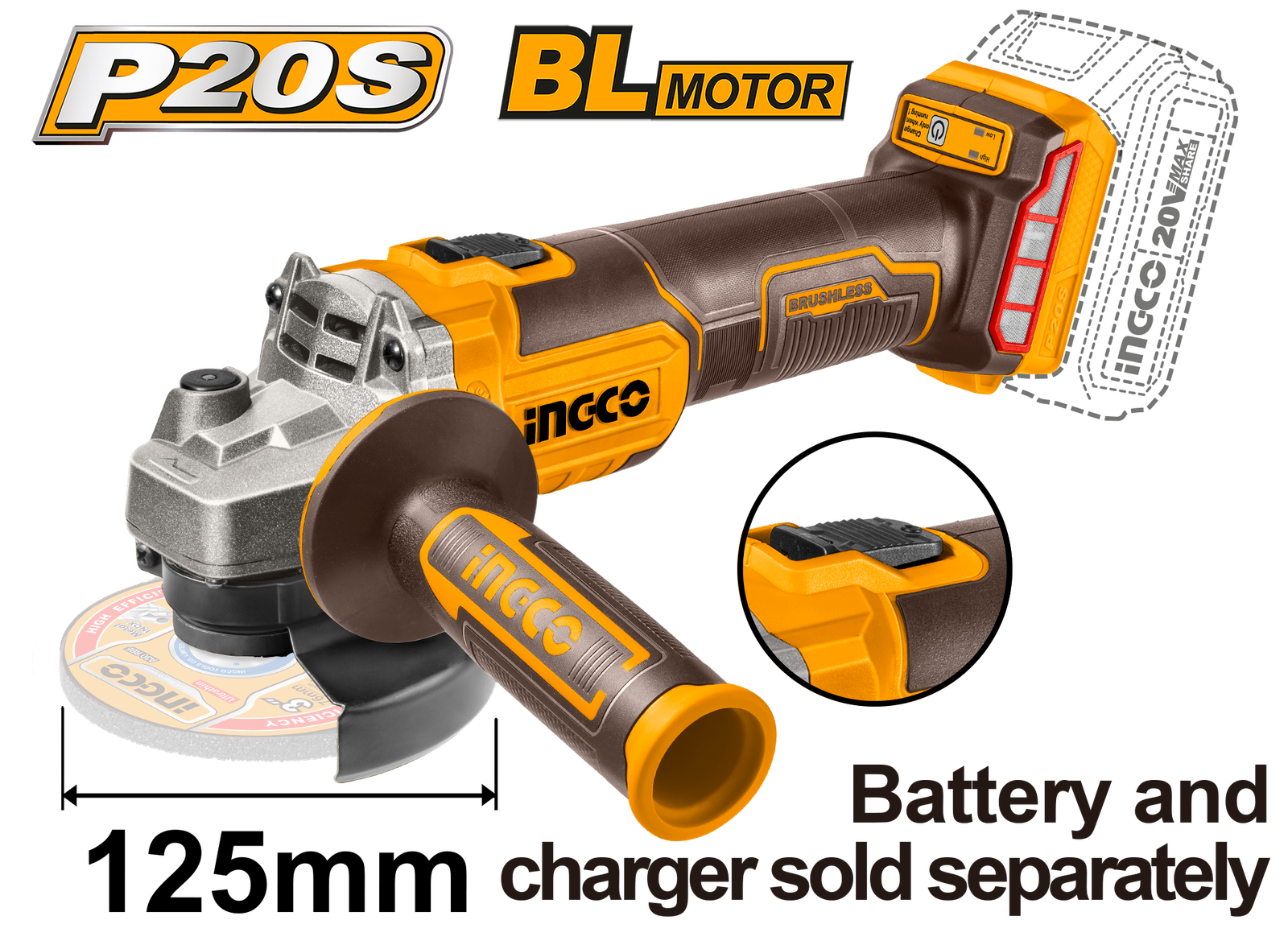 CAGLI201258 (Cordless angle grinder 20V 5″ – P1C6)