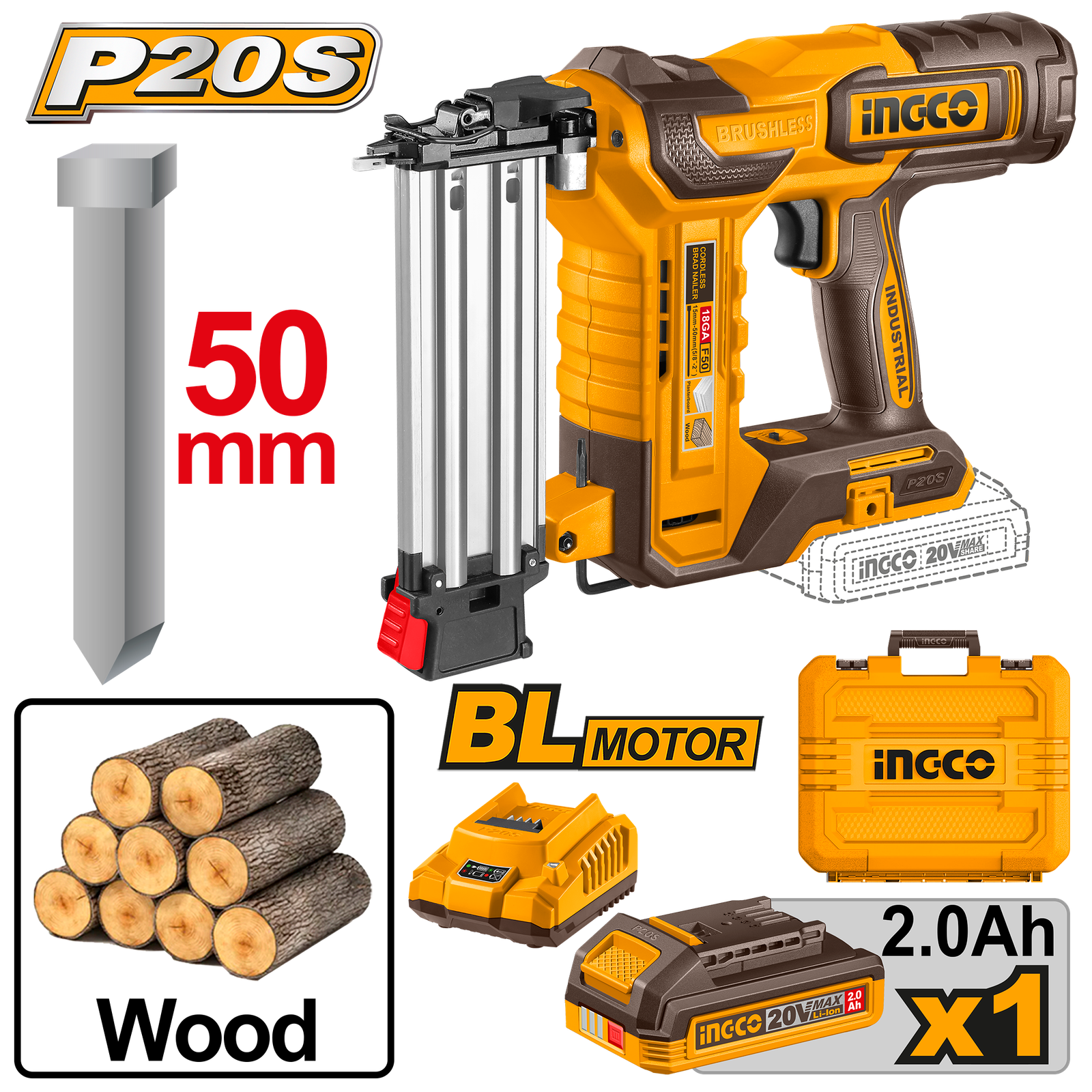CBNLI5008 (Cordless brad nailer 20V wood 50mm + Battery – P1C4)