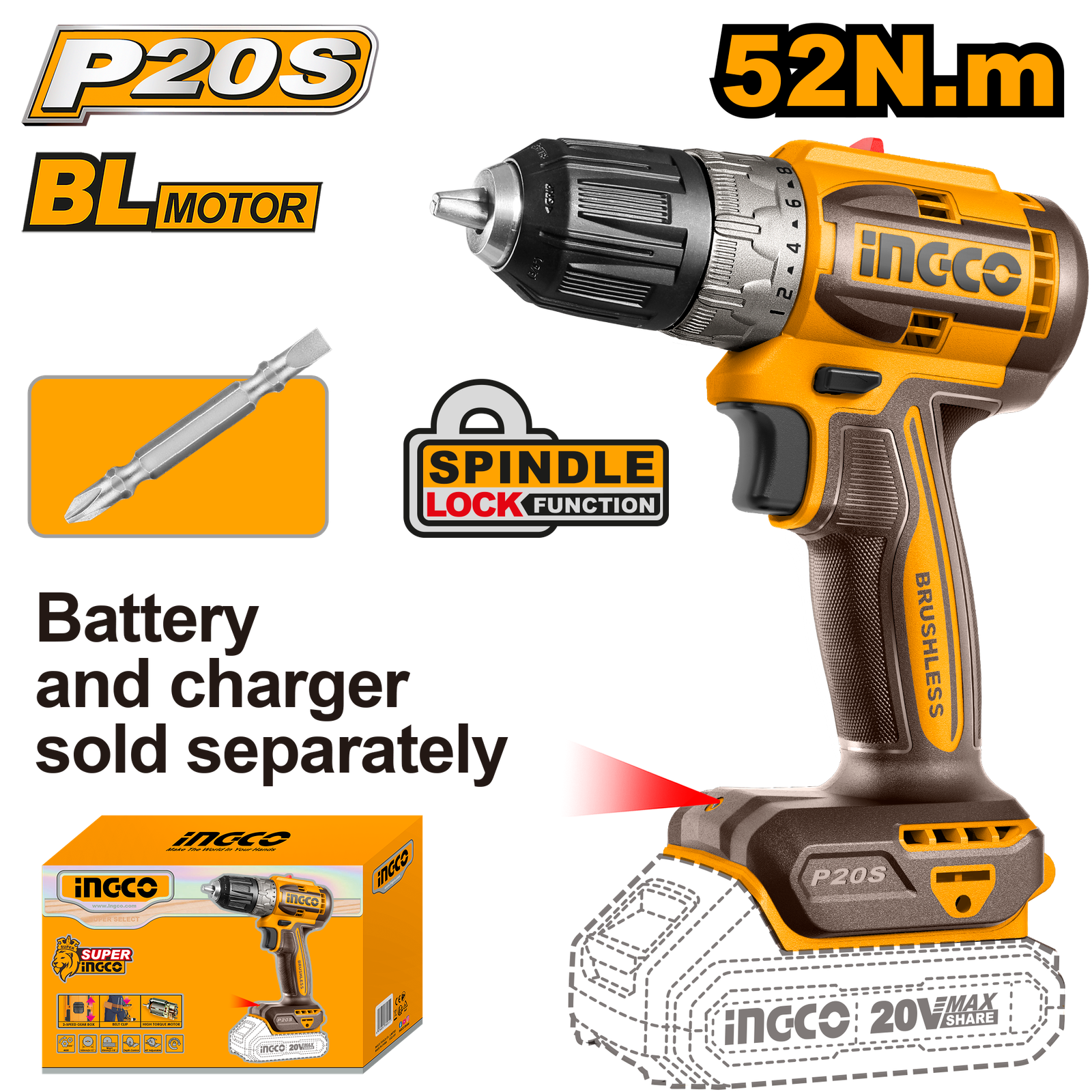 | Brushless motor Voltage: 20V No-load speed: 0-550/0-2000rpm Max torque: 52Nm Plastic chuck Chuck capacity: 0.8-10mm(1/32-3/8″) Torque settings: 22+1 Mechanical 2-speed gear Spindle lock function Integrated LED work light Include: 1 Pcs Cr-V 65mm bit Charger sold separately Packed by color box |