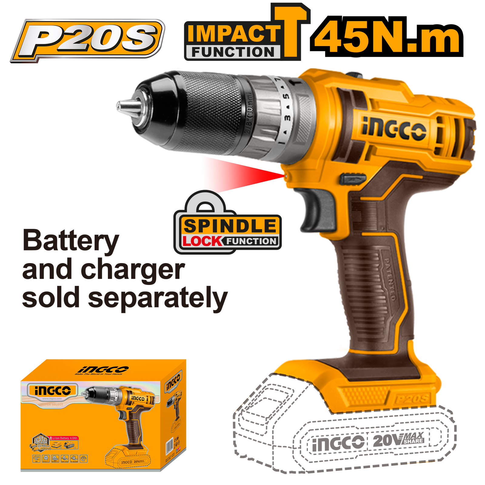 CIDLI201455 (Cordless impact drill 20V 45Nm – P1C5)