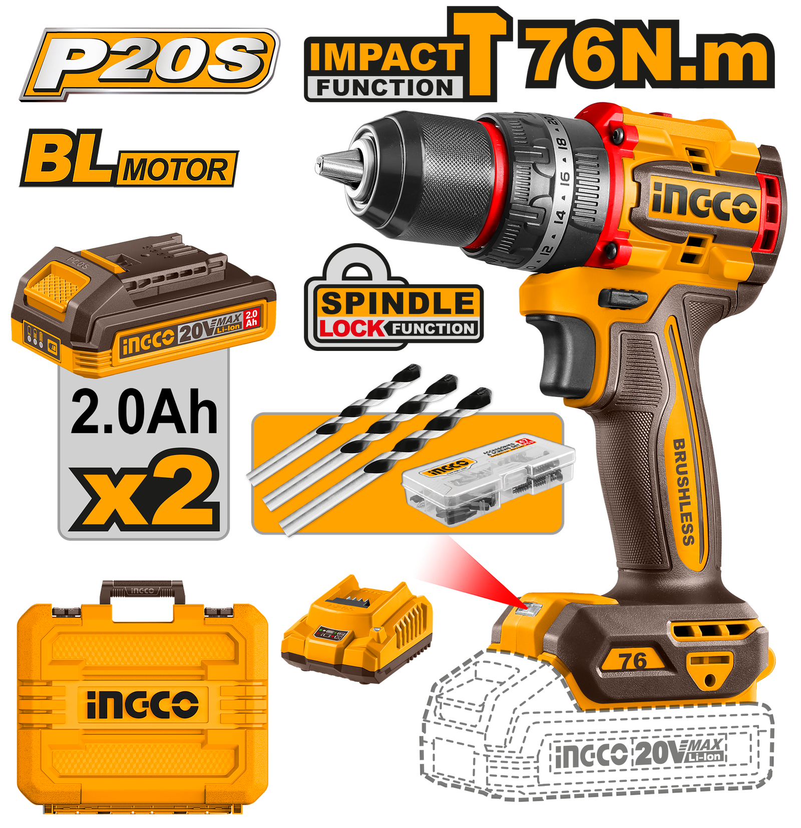 CIDLI20768 (Cordless Impact Drill 20V 76Nm + 2 Battery – P1C5)
