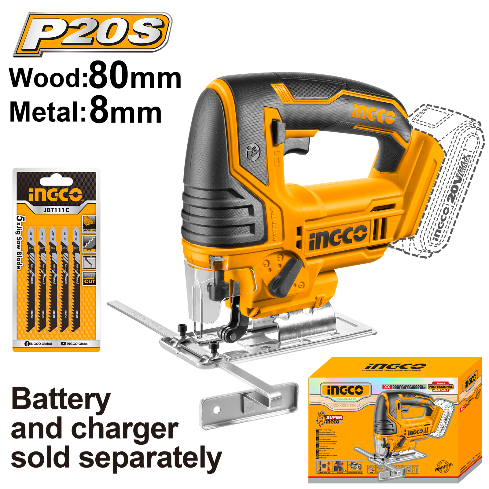 | Voltage:20V No-load speed:2400rpm Cutting capacity: Wood: 80mm Metal: 8mm With 5pcs saw blades Battery and charger sold separately Packed by color box |