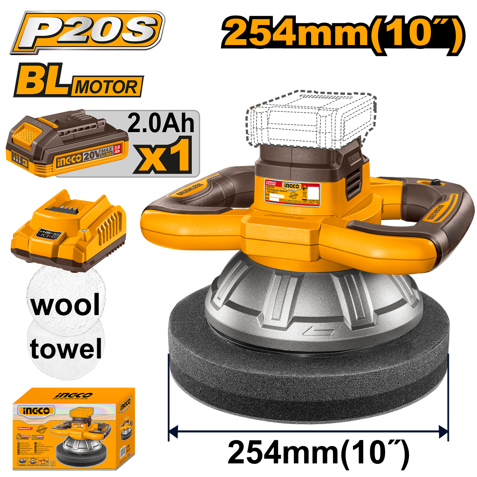 | Brushless motor Voltage: 20V No-load speed: 2500rpm Polishing disc diameter : 254mm Eccentric distance: 5mm Include: 1 Pcs wool polishing bonnet 1 Pcs towel polishing bonnet 1 Pcs 2.0Ah battery pack(FBLI20011) 1 Pcs charger(FCLI2001) Charge volts:220V-240V~50/60Hz Packed by color box |