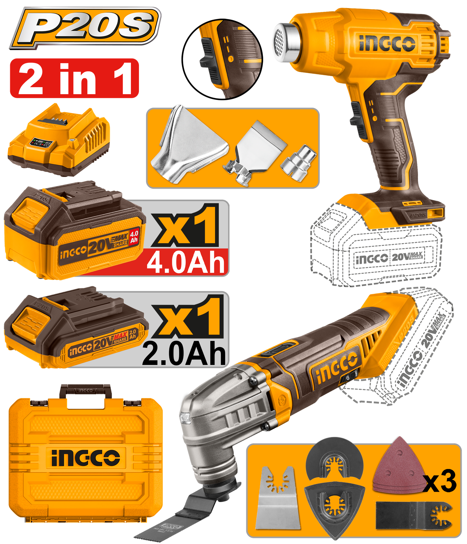 COSLI230703 (Cordless 2 Pcs combo kit Heat Gun + Multi Tool 20V – P1C4)