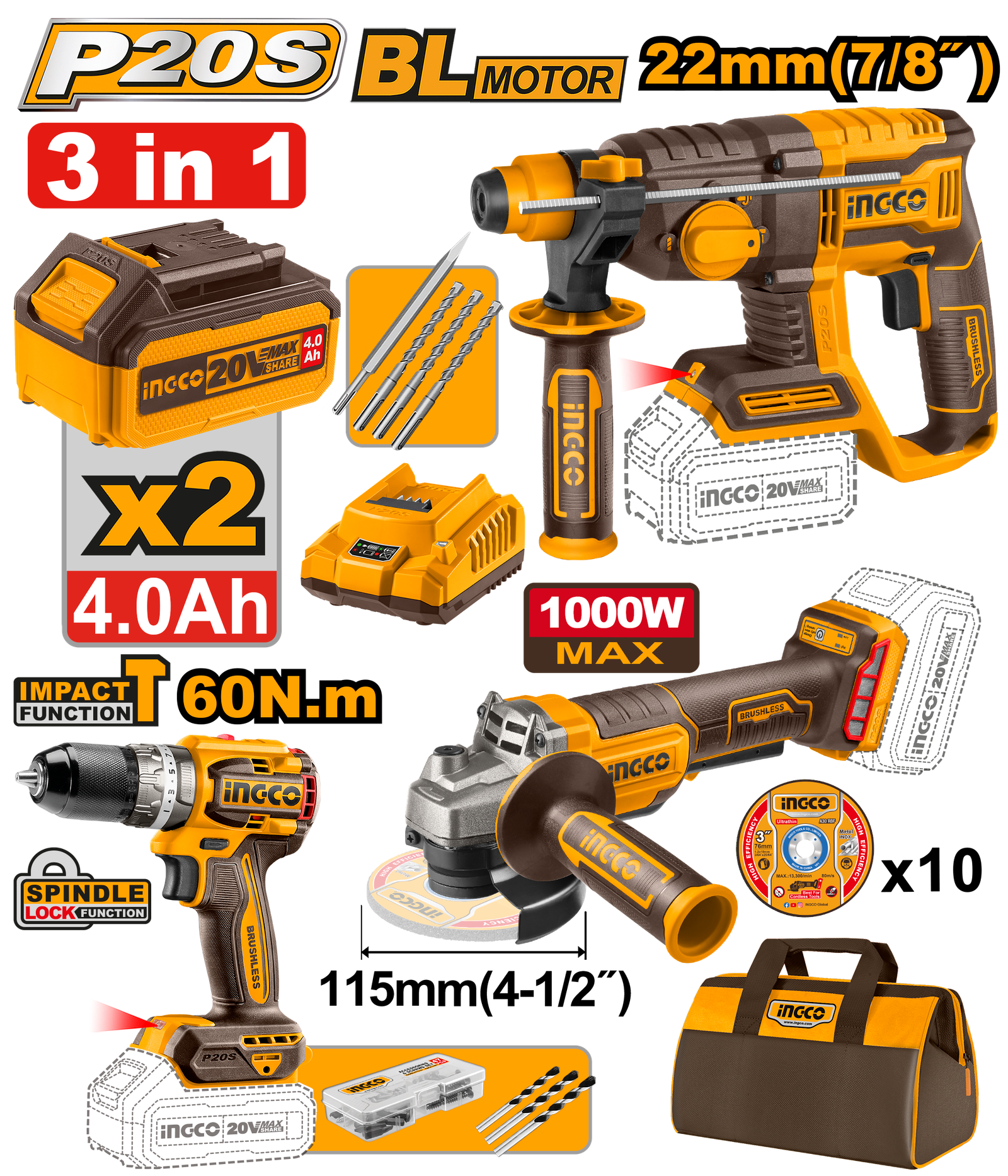 COSLI240202 (Cordless Rotary Hammer + Impact drill + angle grinder 20v + 2 Battery)