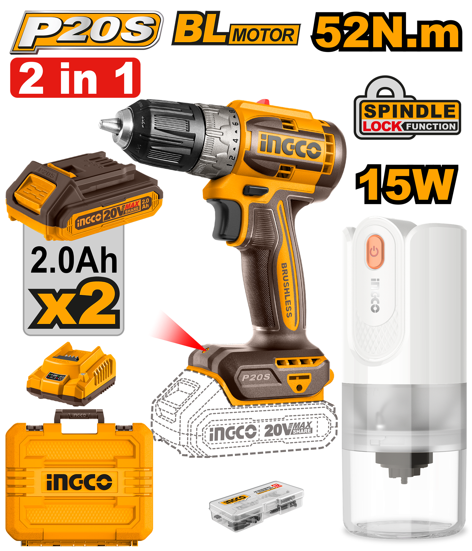 | With 1pcs lithium-ion brushless cordless drill(CDLI20453) With 1pcs cordless coffee grinder(CPB029T) Lithium-Ion brushless cordless drill(CDLI20453): Voltage: 20V Brushless motor No-load speed: 0-550/0-2000rpm Max torque: 52Nm Plastic chuck Chuck capacity: 0.8-10mm Torque settings: 22+1 Mechanical 2-speed gear Spindle lock function Integrated LED work light LED battery power indicator Cordless coffee grinder(CPB029T): Capacity: 25g Voltage: DC 3.7V Wattage: 15W Battery volume: 1500mAh Adjustable coarseness Ceramic grinding core Include: 1 Pcs USB charging line 1 Pcs 2-in-1 spoon and brush 47 Pcs accessories 2 Pcs 2.0Ah battery pack(FBLI20011) 1 Pcs charger(FCLI2001) Charge volts: 220-240V~50/60Hz Packed by carrying case |