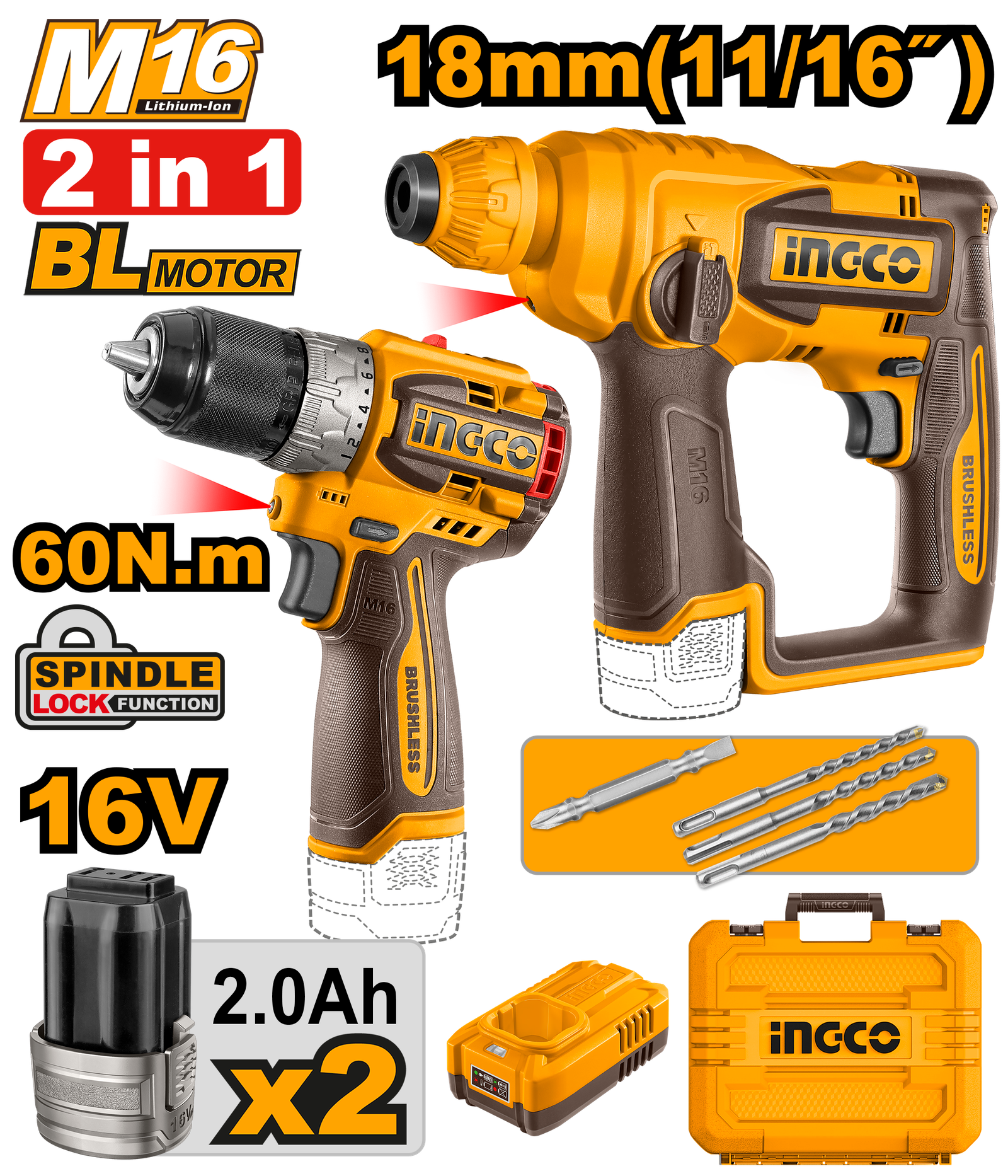 COSLI241295 (Cordless 16V Drill 60Nm + Rotary Hammer 18mm + 2 Battery – C4)