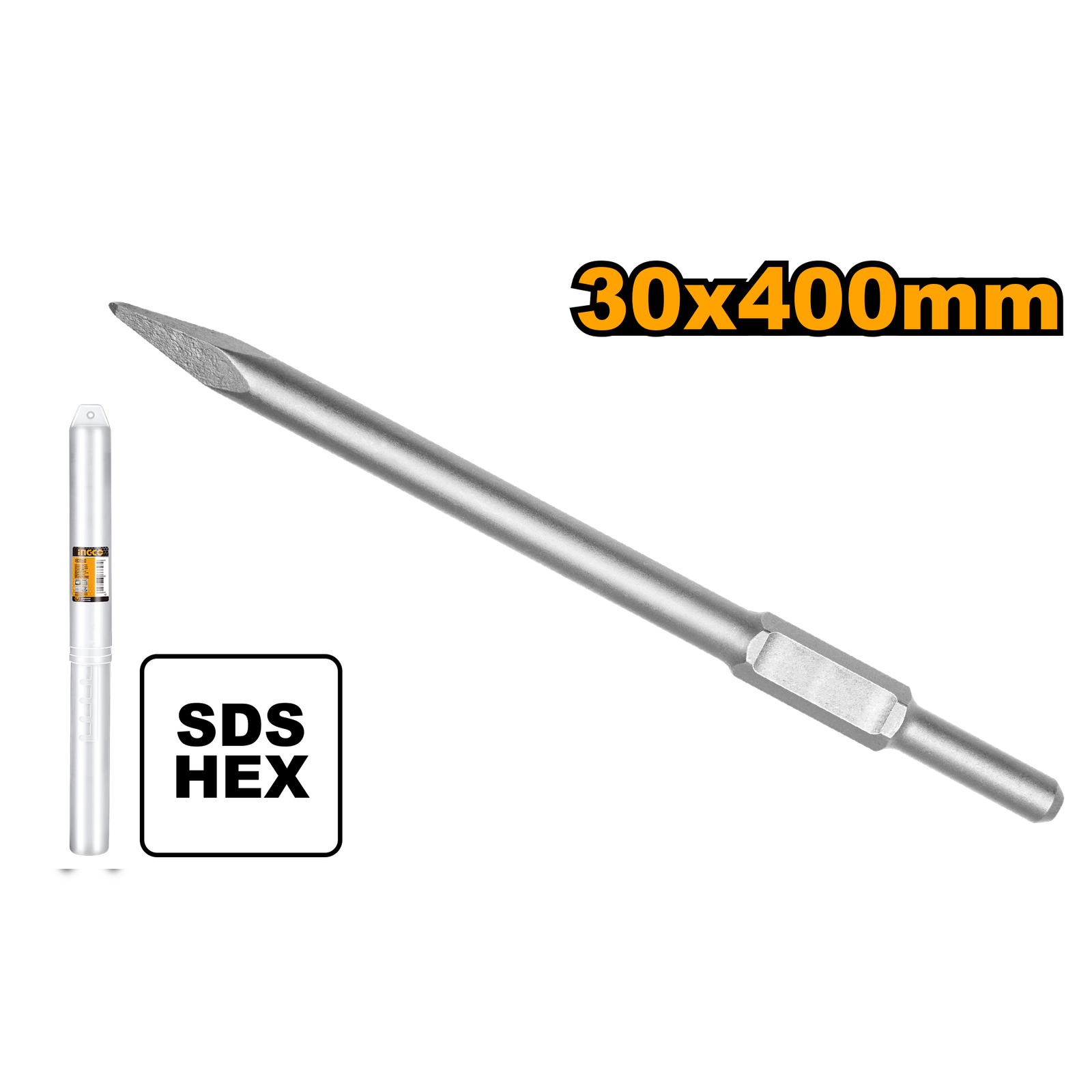 | Hex chisel,30X 400mm,point Wear-resistant, high hardness and long service life Used in concrete, brick wall,cement Packed by plastic tube |