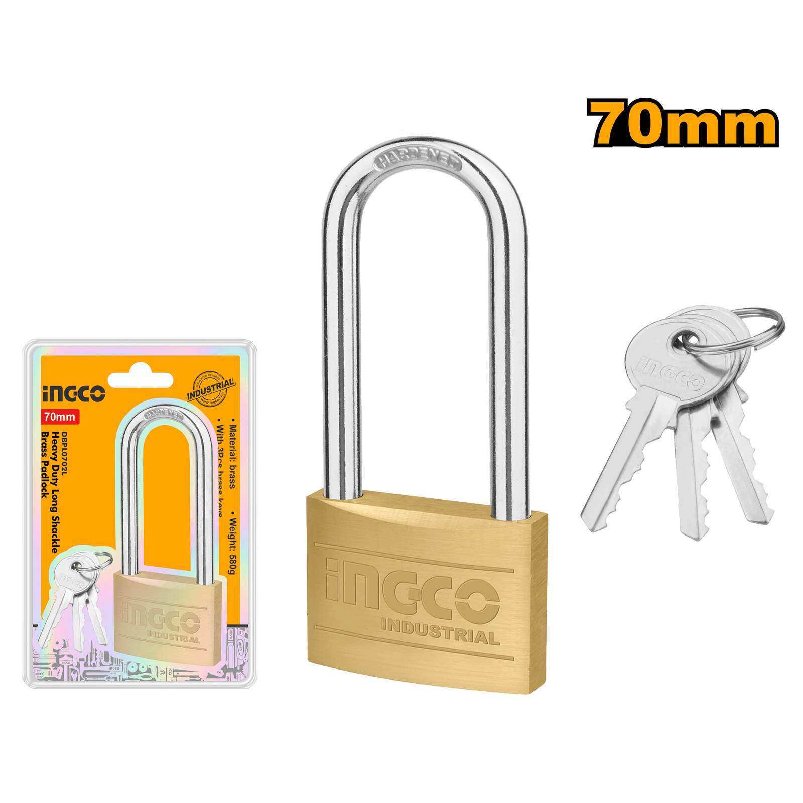 | Long lock beam Size:70mm Weight:580g Lock body material: brass Solid brass cylinder with pins Brass keys and parts for longer service life With 3 pcs brass keys Packed by double blister |