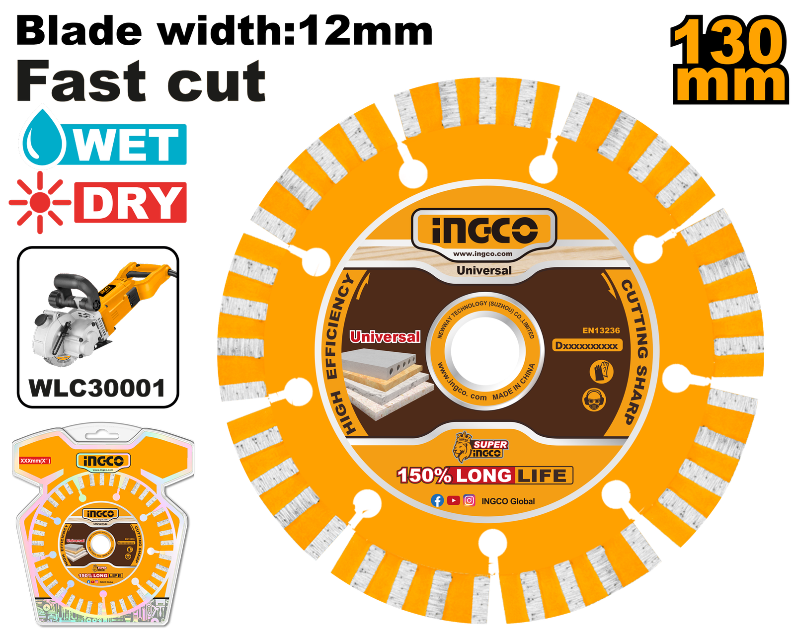 | 130(5-1/8″)X20mm Blade width:12mm Metal base thickness:1.6mm Universal Match with WLC30001 High concentration diamond Packed by double blister |