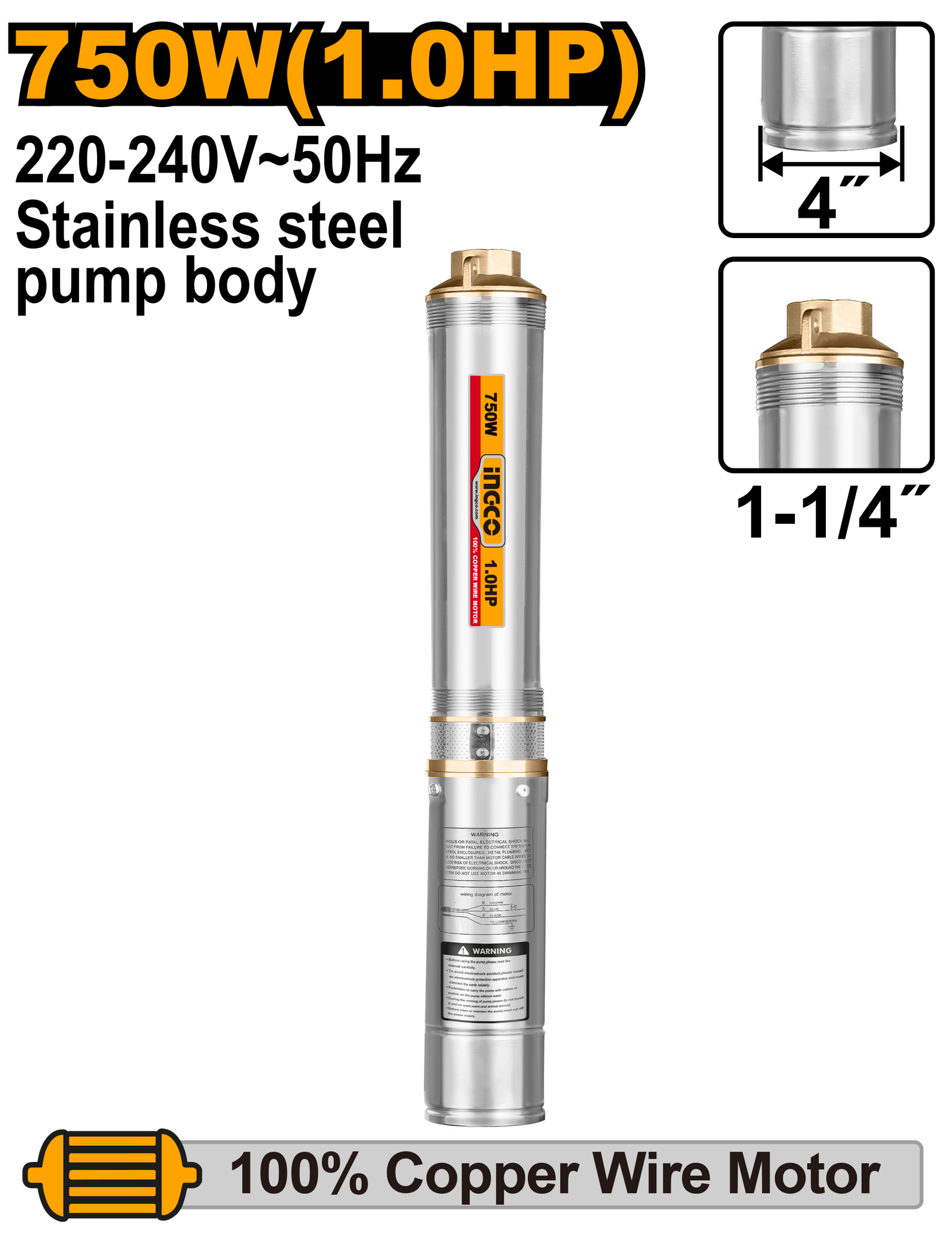 | Voltage:220-240V~50Hz Rated power:750W(1.0HP) Max.head:80m Max.flow:6.0m³/h Pipe diameter:1-1/4″ Well pump body:4″ Impeller:10 stage Copper wire motor Pump body:Stainless steel 20m length cable Control box not included Packed by carton box |