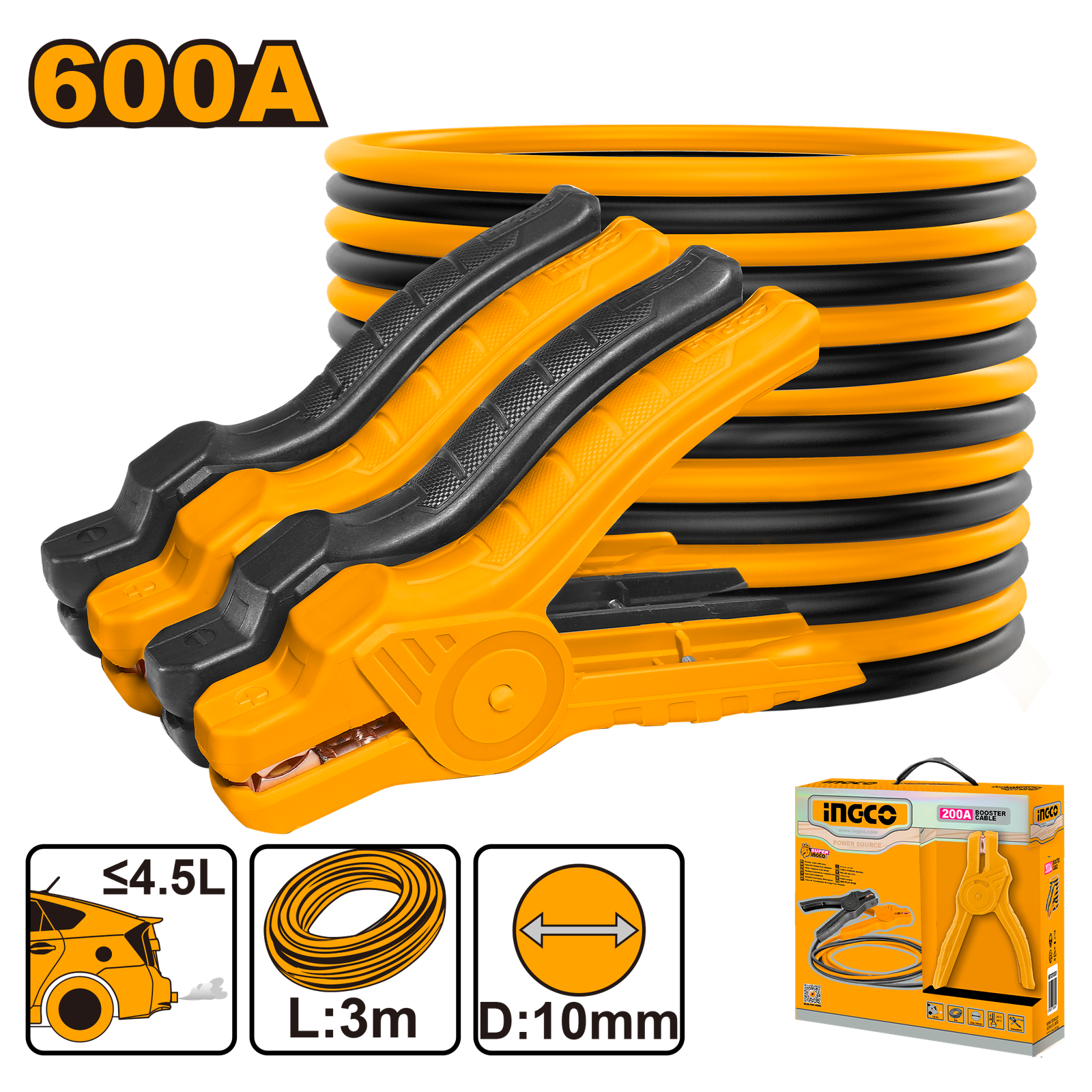 | Current: 600AMP Clamp size: 18x10cm Suitable for emission ≤4.5L car Cable material: copper coated aluminum Cable outside diameter: 10mm Cable length: 3m Packed by color box |