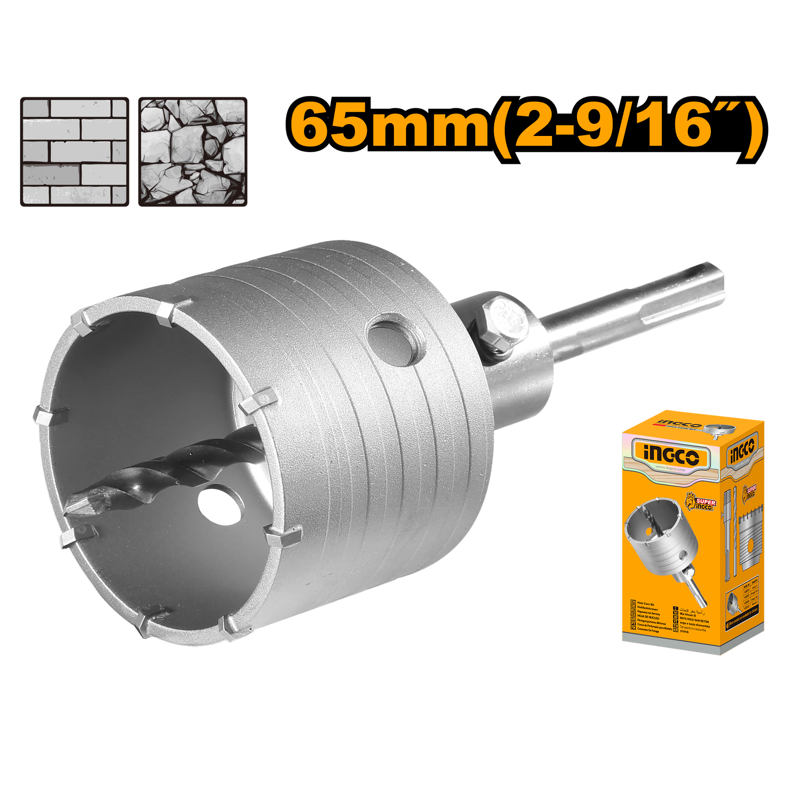 | Diameter:65mm(2-9/16″) 8pcs TCT blades With 1pcs 110mm adaptor With 1pcs 8X110mm masonry drill bit Packed by color box |
