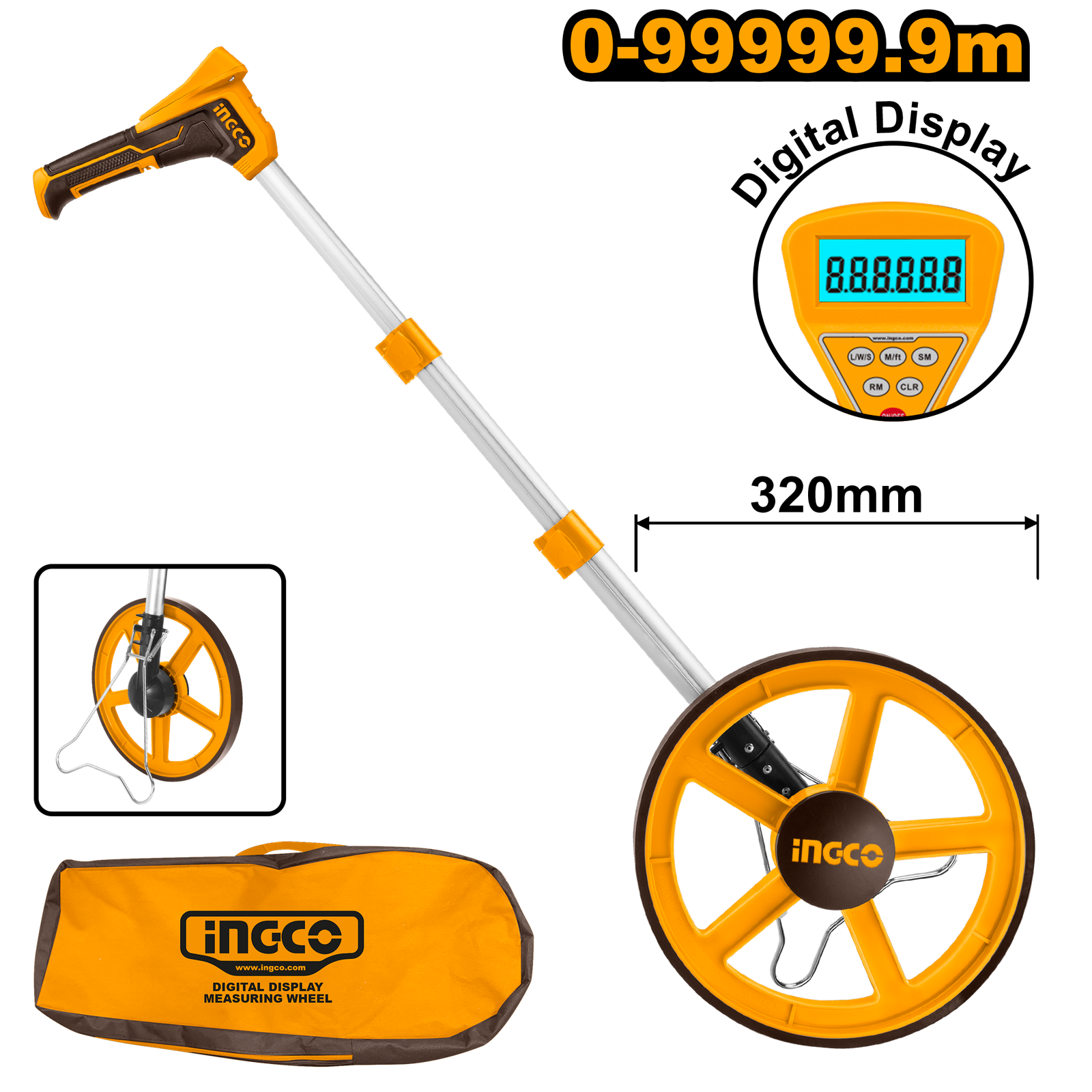| Display resolution:0.1m Tolerance:±5% Measuring range:0-99999.9M Wheel diameter: 320mm Wheel perimeter: 1000mm With digital display and memory With metric and inch dual system With stand With:2PCS LR03 AAA batteries Packed by color box |