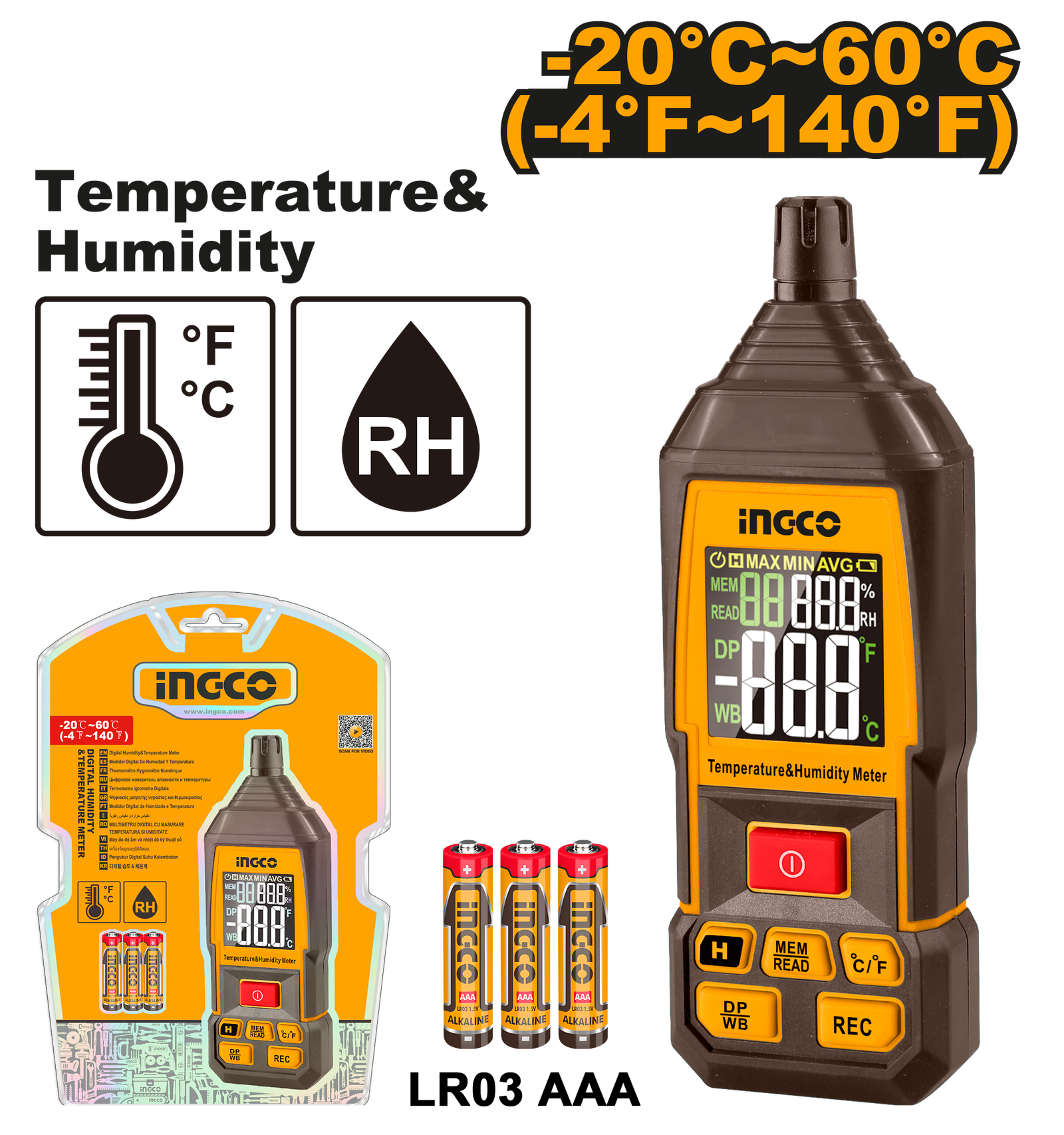 | Ambient temperature:-20℃~60℃(-4℉~140℉) Ambient humidity:0~100% Web bulb temperature:-20℃~60℃(-4℉~140℉) Dew point temperature:-20℃~60℃(-4℉~140℉) With backlight function With lower battery indication function With 3pcs LR03 AAA batteries Packed by double blister |