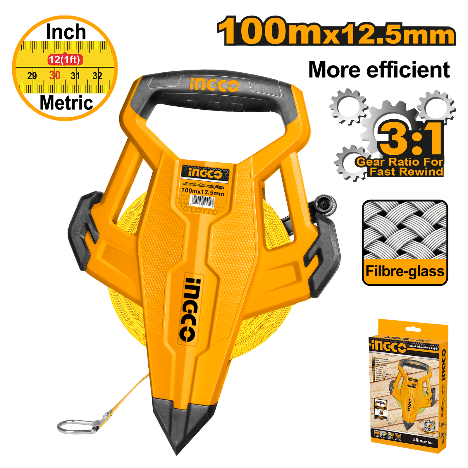| 3:1 Gear ratio for fast rewind Reinforce fiberglass tape Length & width:100mx12.5mm With metric and inch Pure material retracting gear With all rubber cover Integrated handle good for useing and convenient storing Ergonomic handle Packed by color box |