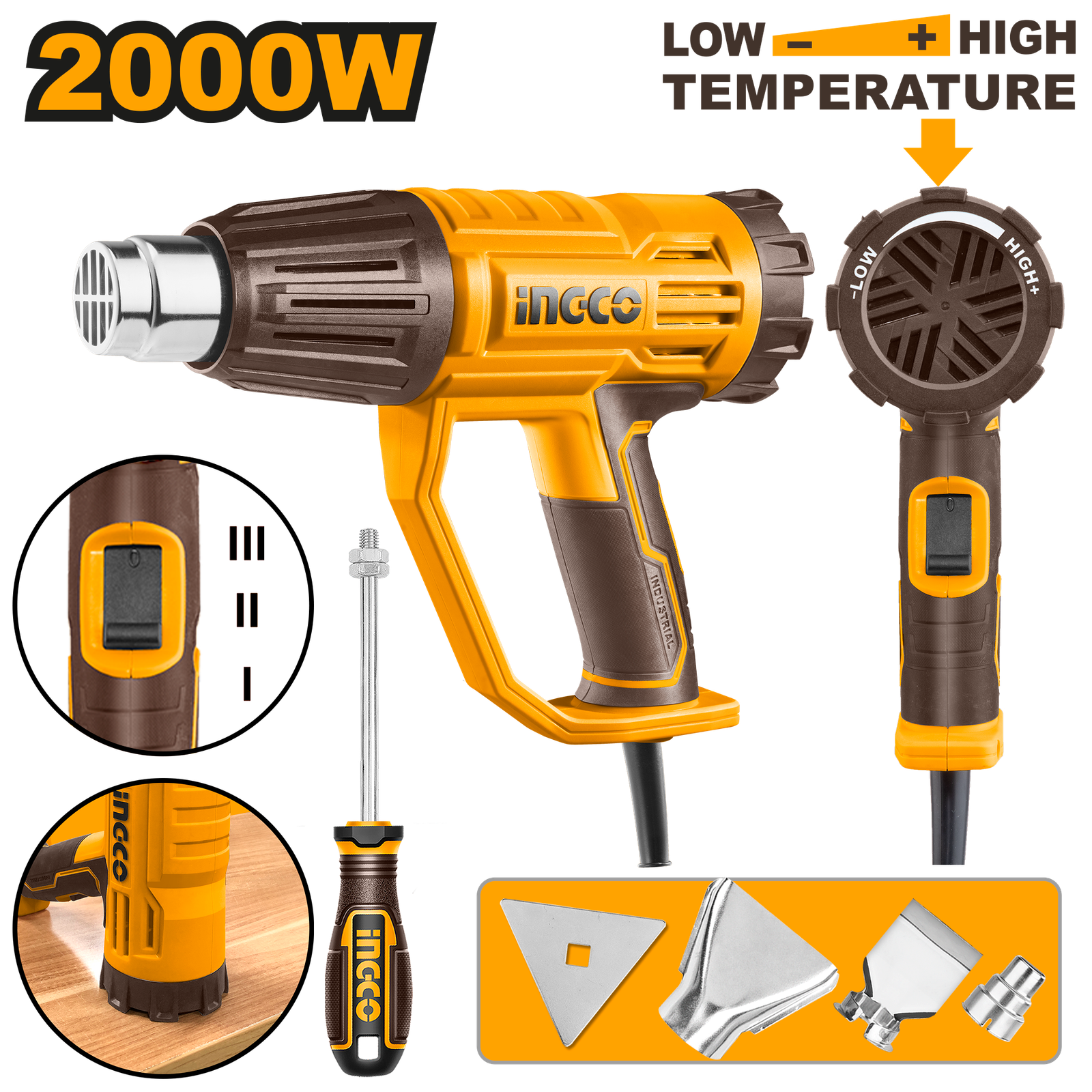 | Voltage: 220V-240V~50/60Hz Input power: 2000W Temperature: 50/50-450°C/50-550°C Airflow: 450/300/450 L/min Adjustable temperature with rotating back for precise control Include: 1 Pcs reduction nozzle 1 Pcs reflector nozzle 1 Pcs flat nozzle 1 Pcs scraper Packed by color box |