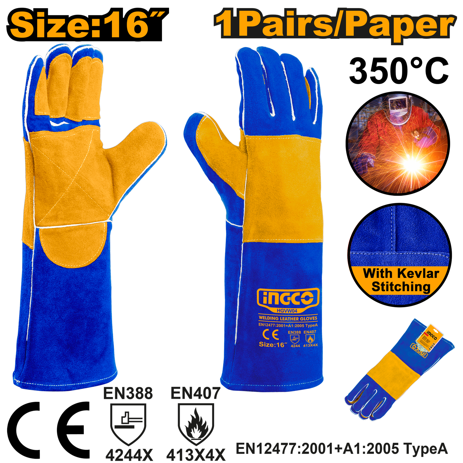 | Size:16 inch AB grade royal leather, palm and back with leather, white diagonal neck with mixed velvet hanging inside, Kevlar fire thread sewing,can prevent sparks from splashing, can withstand 350 degrees Packed by poly bag |