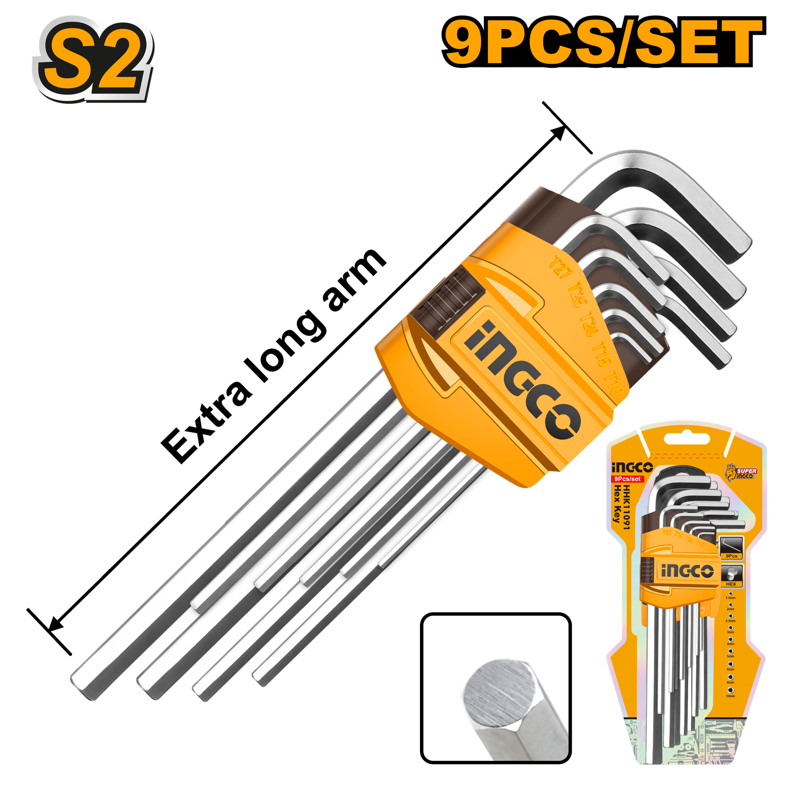 | 9pcs hex key set Materia:S2 Size:1.5mm,2mm, 2.5mm, 3mm, 4mm, 5mm, 6mm, 8mm, 10mm. Extra-long arm Heat treatment and chrome plate Packed by double blister |