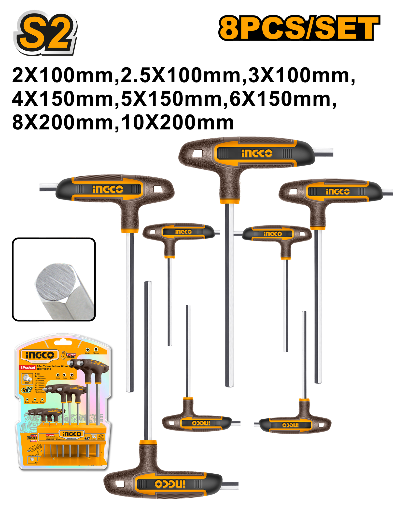 | 8 Pcs T-handle hex wrench set Size:2X100,2.5X100,3X100,4X150,5X150,6X150,8X200,10X200 Material:S2,Heat treatment and chrome plate Brand exclusive shelf Packed by double blister |