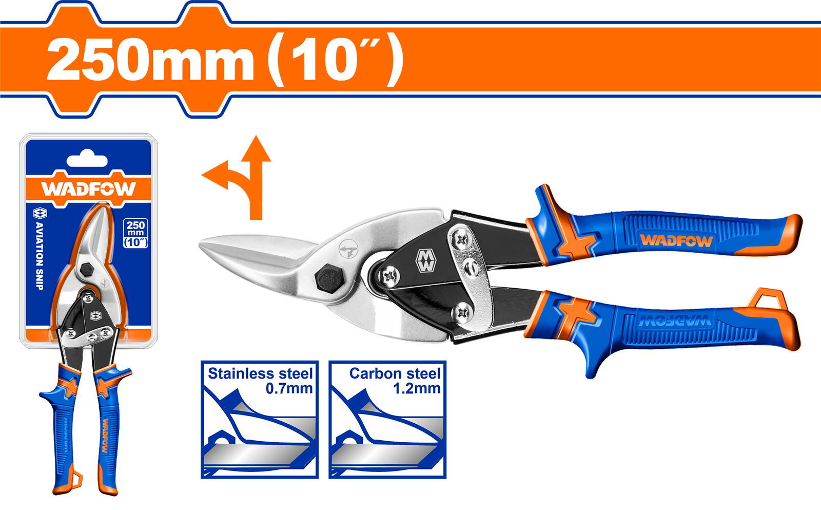 | Aviation snip (Left) Length: 250mm(10″) Max.cutting thicness: Carbon steel ≤1.2mm Stainless steel ≤0.7mm Unique design two tone soft handle Packed by half double blister |