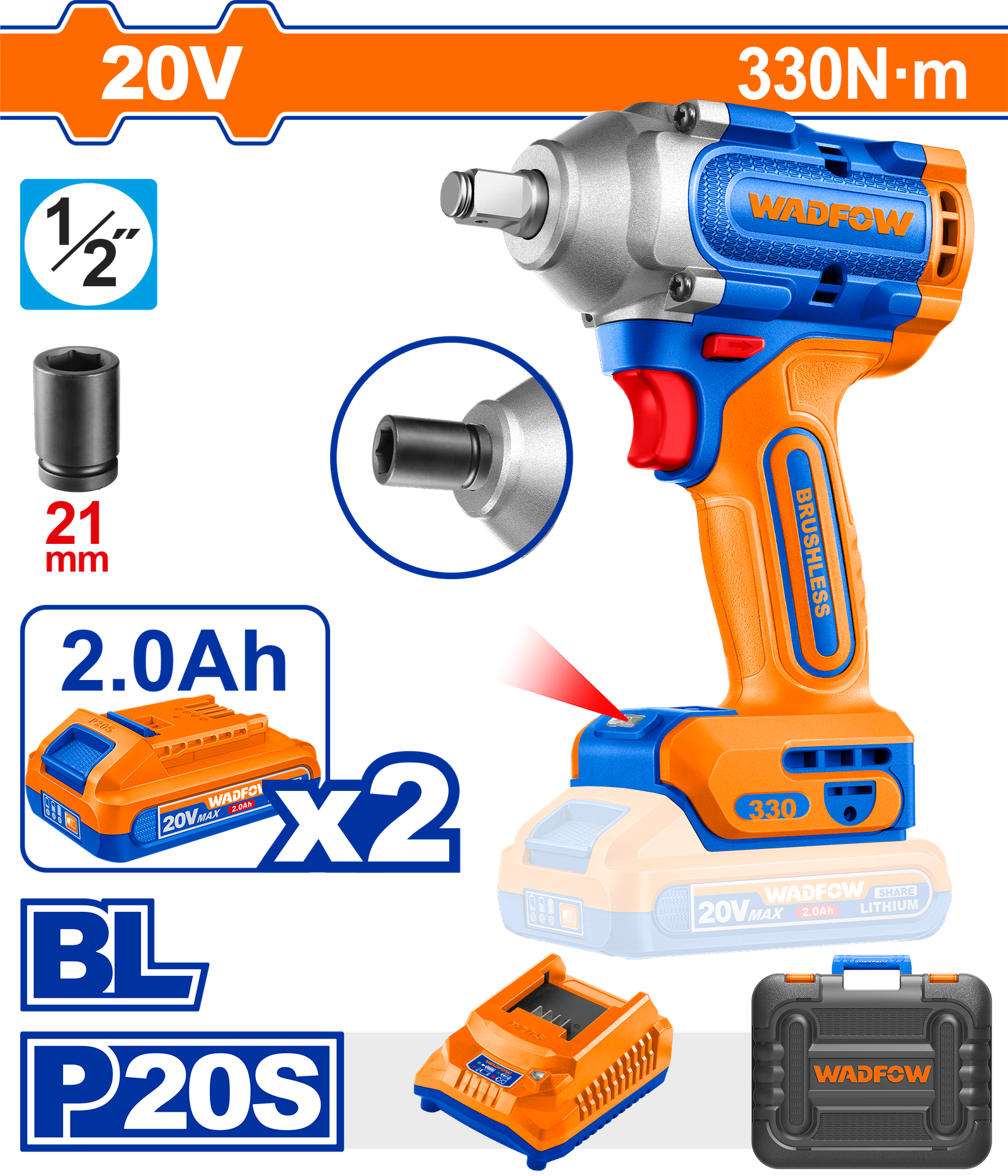 WCD1B33 (Wadfow Cordless impact wrench 330Nm + 2 Batteries 20V – C5)