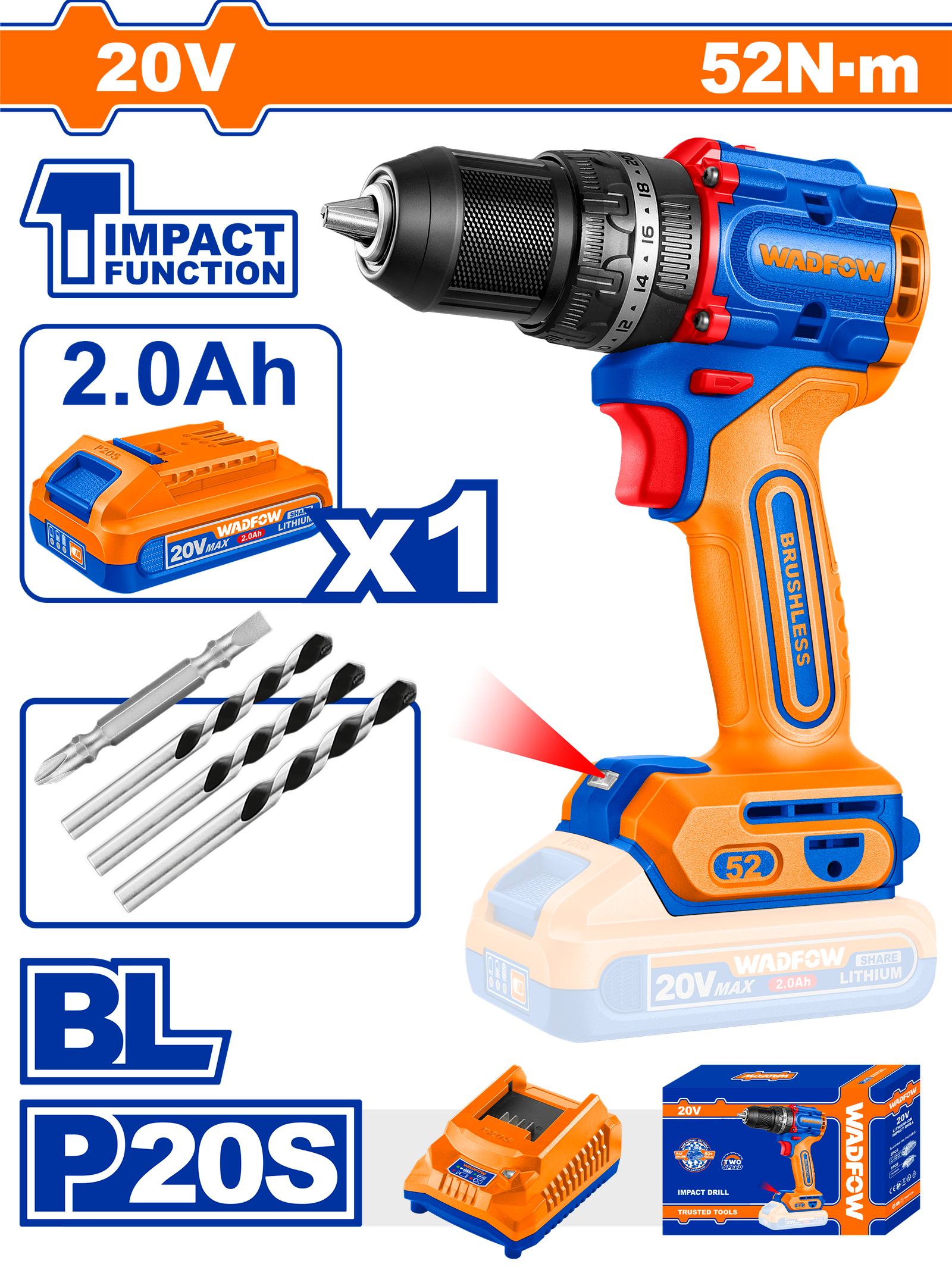 WCDP5282 (Wadfow Compact Brushless Cordless Impact Drill 52Nm + 1 Batteries 20V – C5)