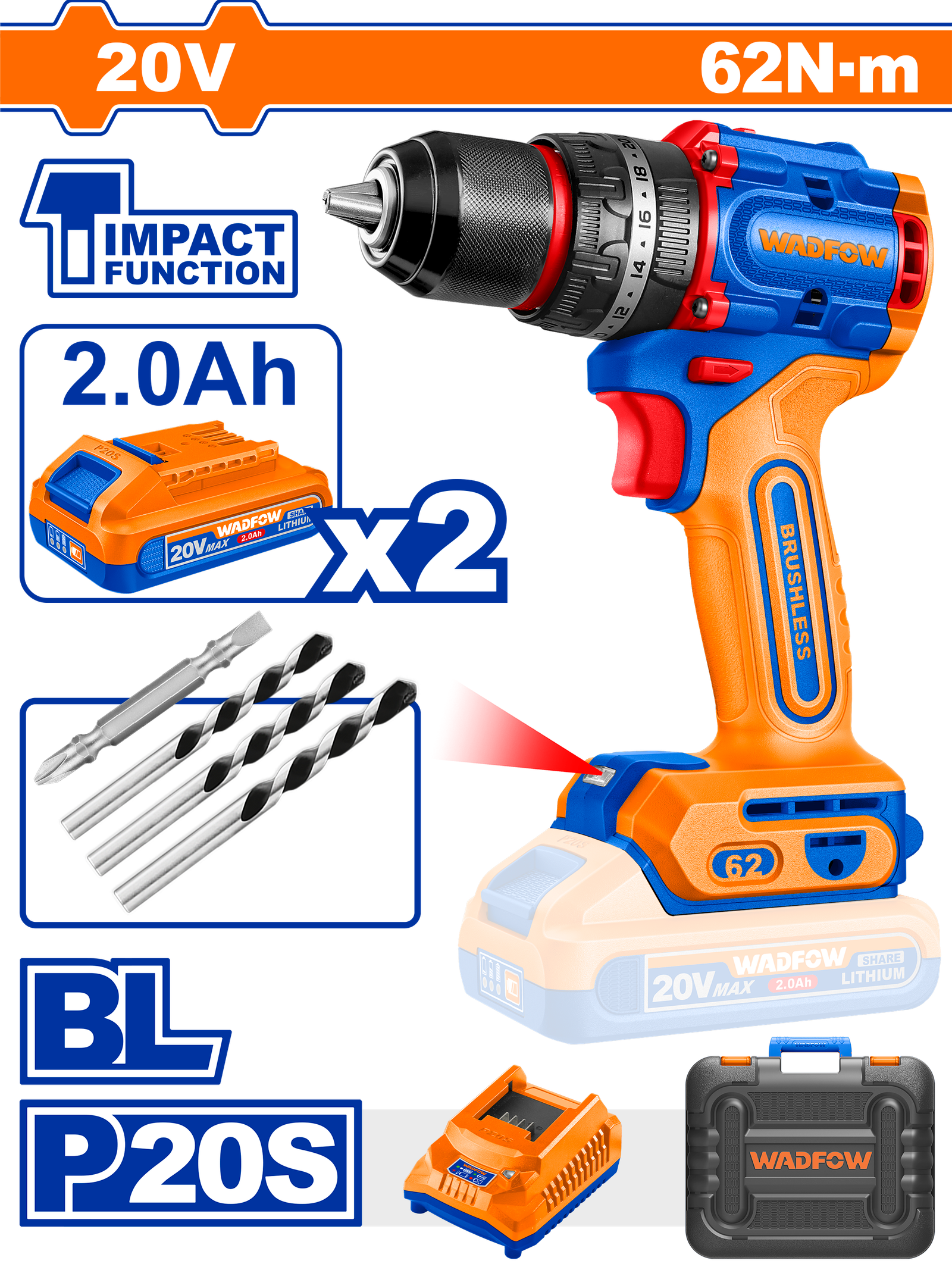 WCDP6281 (Wadfow Compact Brushless Cordless Impact Drill 62Nm + 2 2Ah Batteries – P1C5)