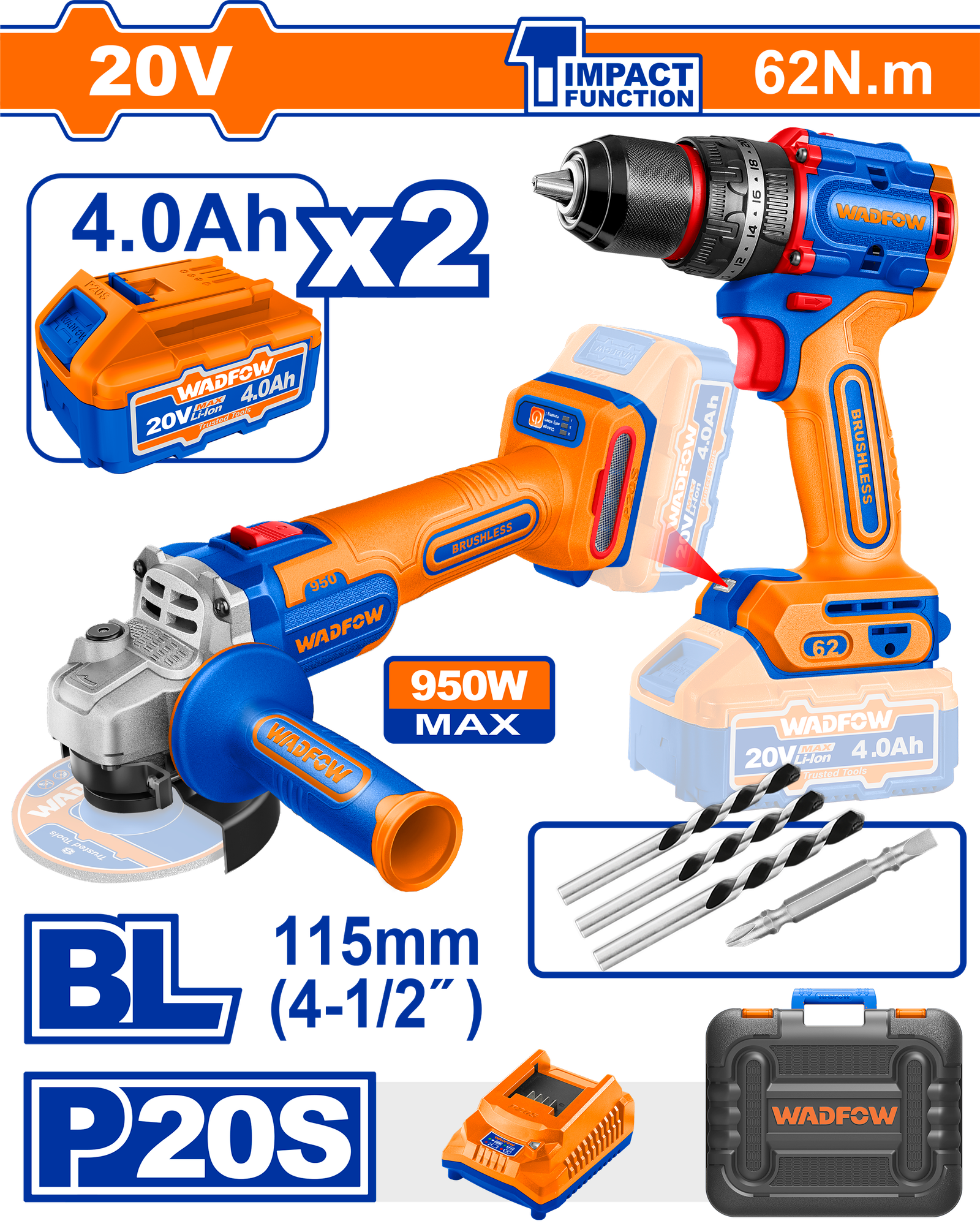 WCK20273 (Wadfow 20V Cordless angle grinder 950W 4.5″ + impact drill 62Nm + 2 Battery – P1C4)