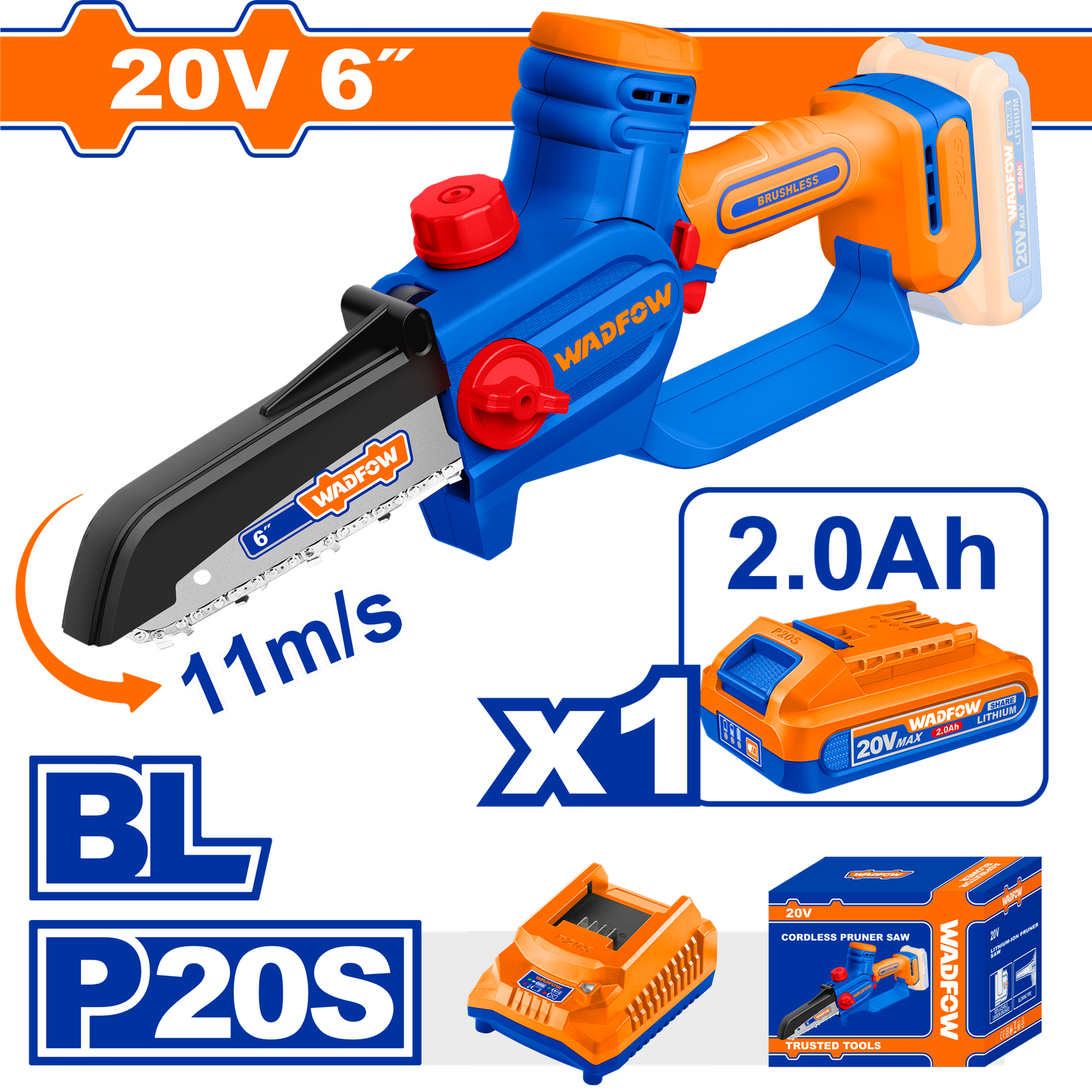 | Brushless motor Voltage:20V Bar length:6″(15cm) Chain speed:11m/s Auto lubrication Include: 1 Pcs 6” saw chain 1 Pcs 6″ shain saw bar 1 Pcs wrench 1 Pcs 2.0Ah battery pack(WLBP520) 1 Pcs charger(WFCP502) Charge volts: 220-240V~50/60Hz Packed by color box |