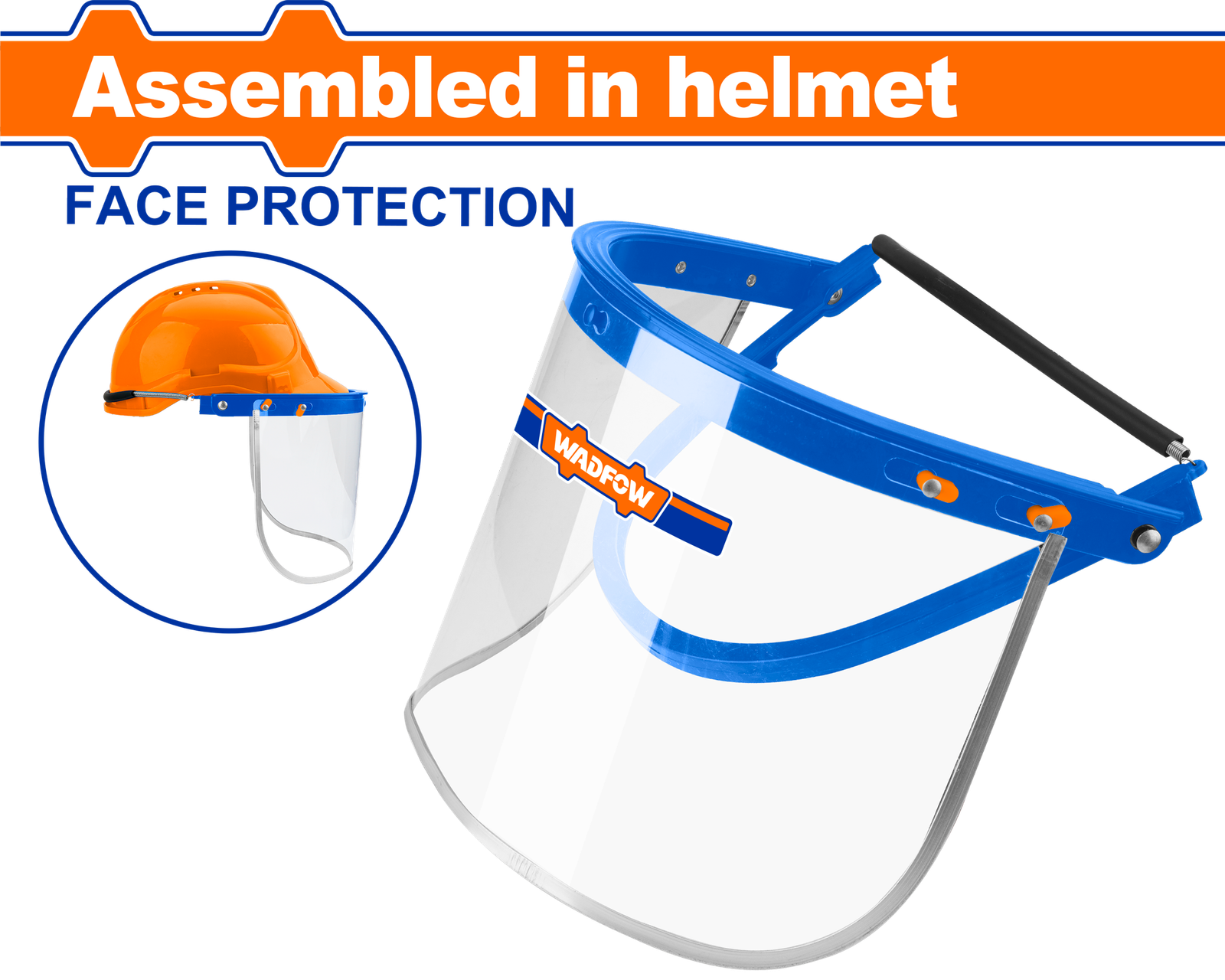 | Face protection Assembled in helmet Face shield mterial:PVC Mpact resistant visor Universal Size features a self-adjusting expandable spring tensioner Packed by label |