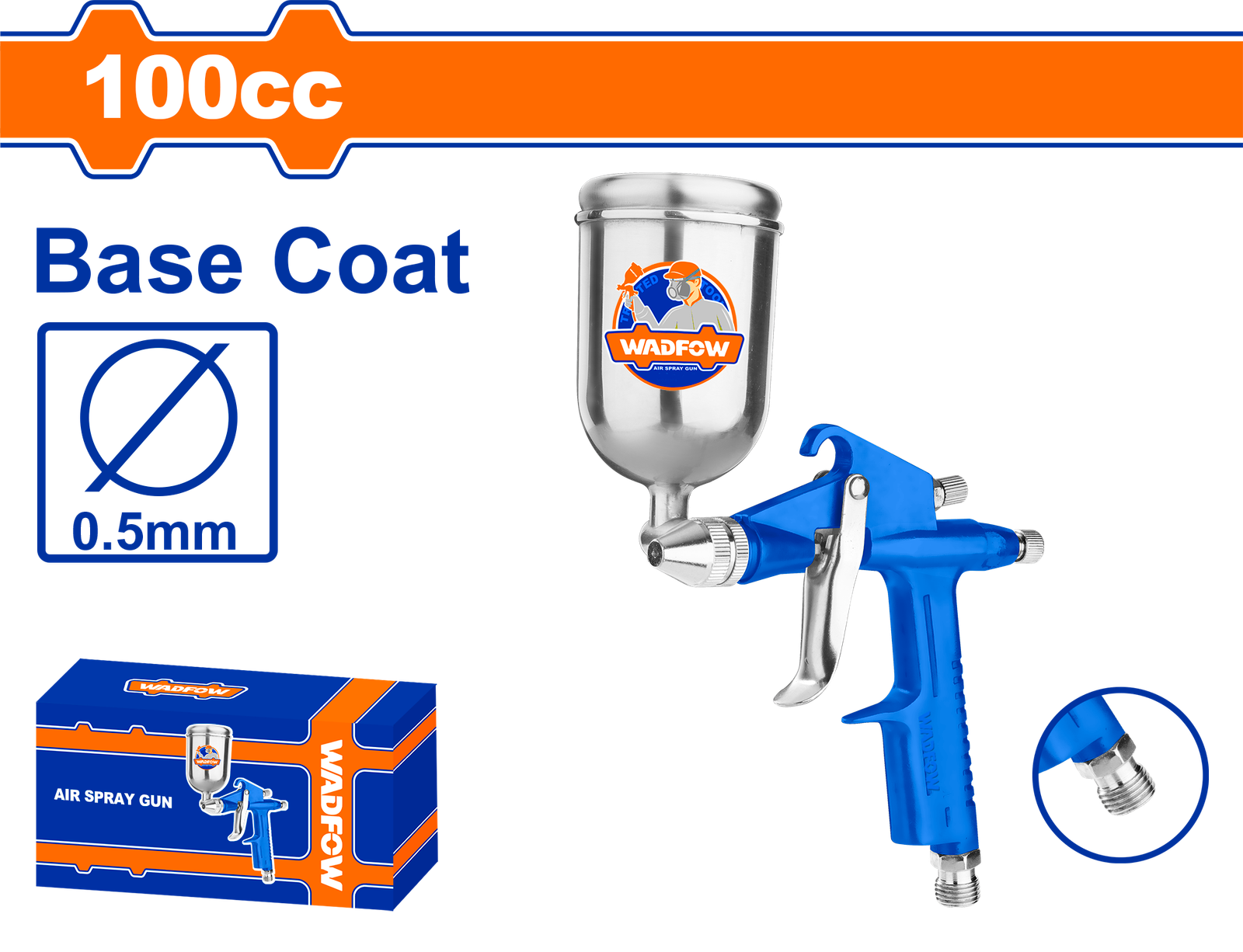 | Without quick plug Standard nozzle:0.5mm Paint capacity:100cc Suitable for base coat Operating pressure:3-4bar Air cons:1-2cfm(28-57l/min) Packed by color box |