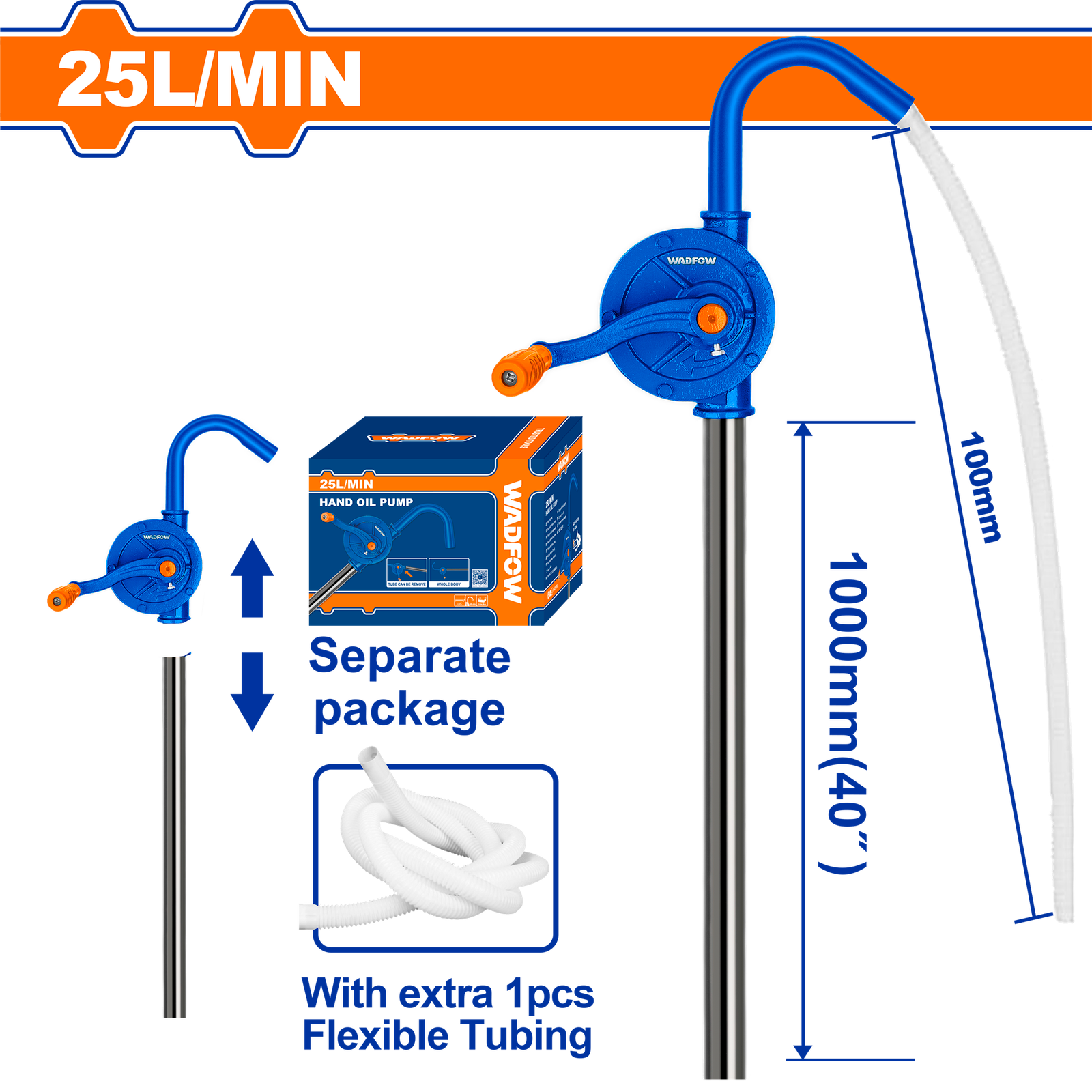 | Hand oil pump Pump rate 25L/min Length: 127cm Pumps diameter: 125mm Material: carbon steel Zinc plating Packed by colour box |