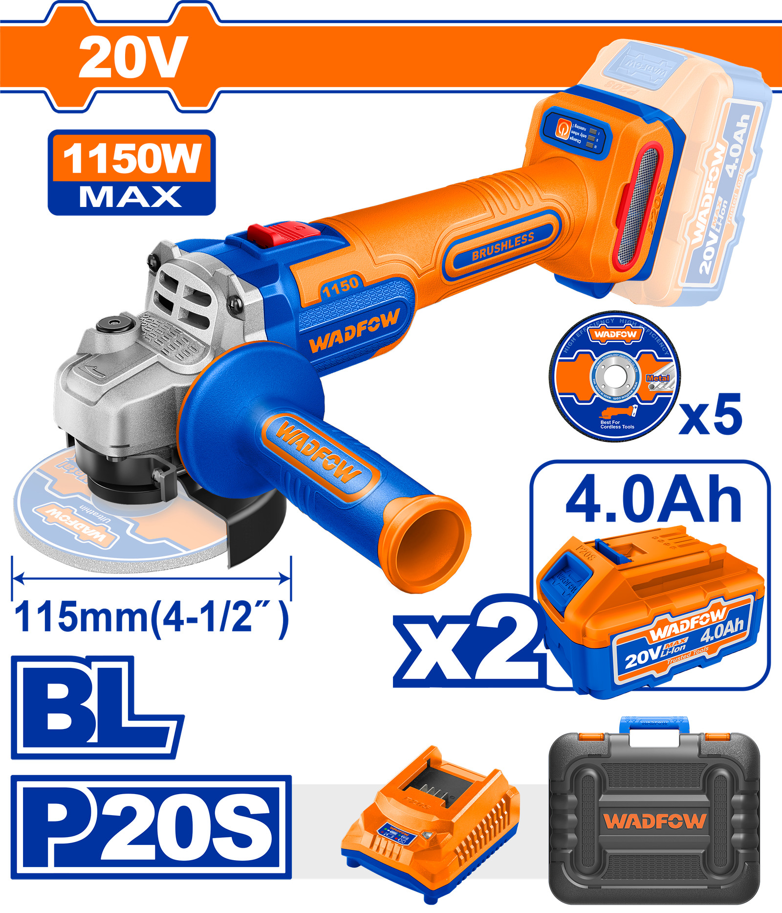 WLAPB522 (Wadfow Cordless angle grinder 20V 1150W 4.5″ + 2 Battery – P1C4)
