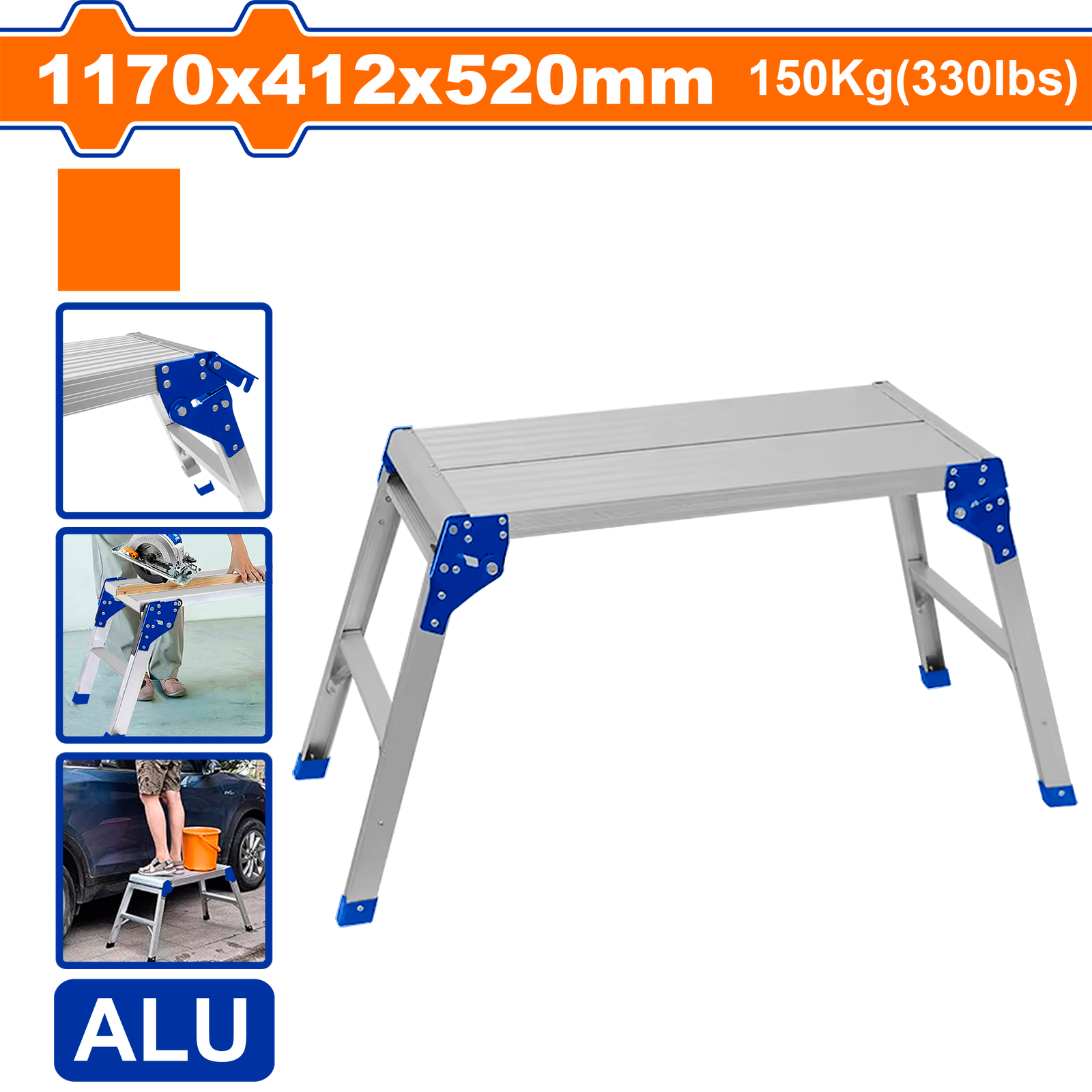 | Material:aluminum Platform length:76cm Platform width:30cm Open size: 1170X412X520mm Approx. weight: 5.2kg Max. load: 150kg(330lbs) Packed by poly bag |